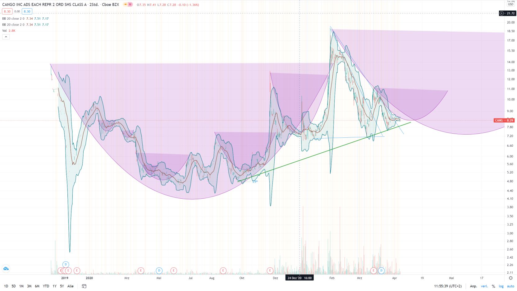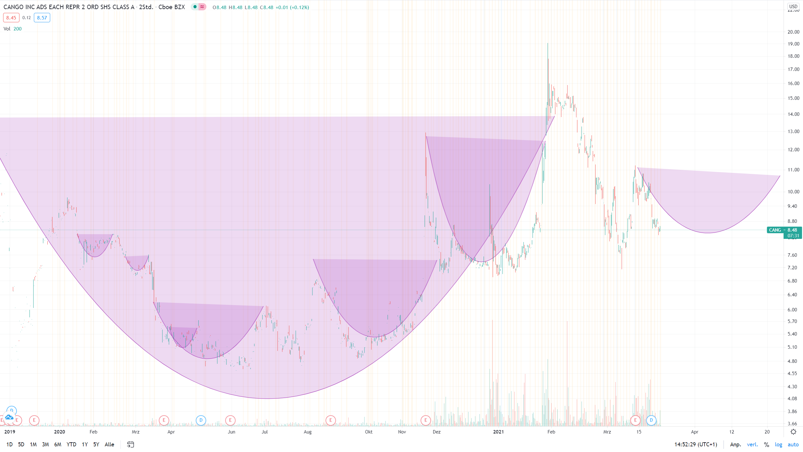 Bei Cango glaube ich aber mittlerweile nicht mehr, dass er den Aufwärtsdruck sofort entleert und einen simpel durchlaufenden Aufwärtstrend fortführt, sondern an in cups eingelagerte Cup an handles. So eine richtig verschnörkelten Verlauf, das lagert im Normalfall ordentlich Potential der Hauptbewegung ein. sowas würde sich auch mit Gabiis Einschätzung höherer Kursziele decken.