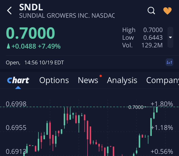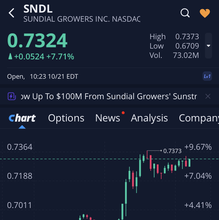 Heute dann ganz ordentlich rauf. Ein Lebenszeichen von Sundial. Fehlt noch einiges, um das rot in meinem Depot auszugleichen, aber immerhin ein Anfang. Für mich als Außenstehenden erscheint es mir als ein super Geschäft: "With over 25 years of experience in retailing regulated products, Alcanna is Canada’s largest private liquor retailer, operating 171 locations predominantly in Alberta under its three retail brands “Wine and Beyond”, “Liquor Depot” and “Ace Liquor”. Alcanna’s strategic partner, in which it holds an approximately 63% equity interest, Nova Cannabis Inc. (TSX: NOVC) (“Nova”), is one of Canada’s largest cannabis retailers offering a wide range of high-quality cannabis products at value prices. Nova currently operates 62 stores across Alberta, Saskatchewan and Ontario primarily under the “Value Buds” and “Nova Cannabis” banners." https://www.sndlgroup.com/press_releases/...rs-to-acquire-alcanna-inc