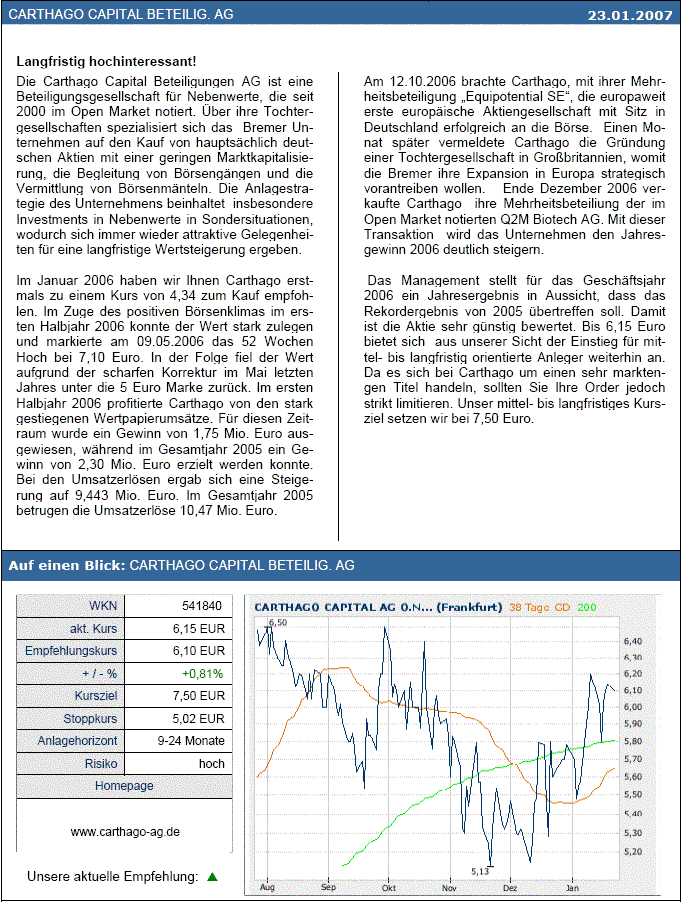Da Carthago auch für 2007 einen guten Ausblick gegeben hat, wird das EK sicherlich Ende 2007 bei 5,5-6,0 € pro Aktie liegen.