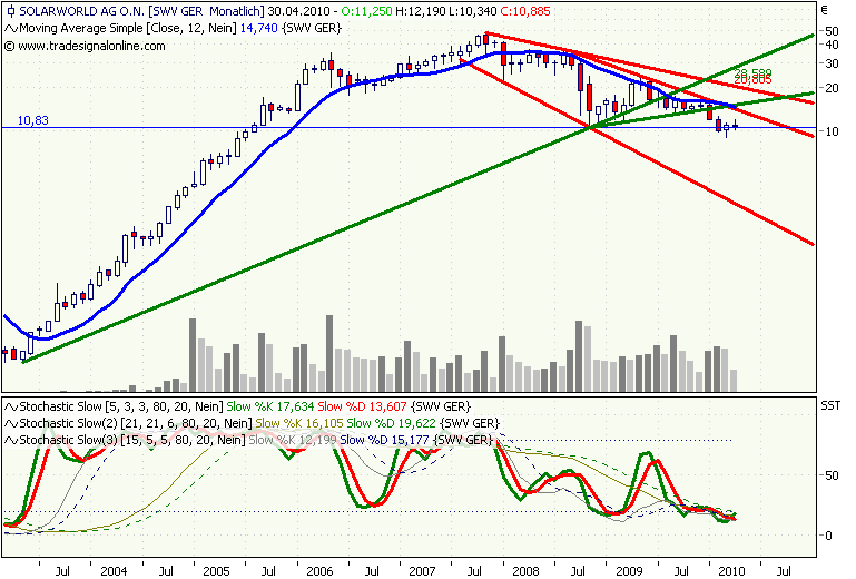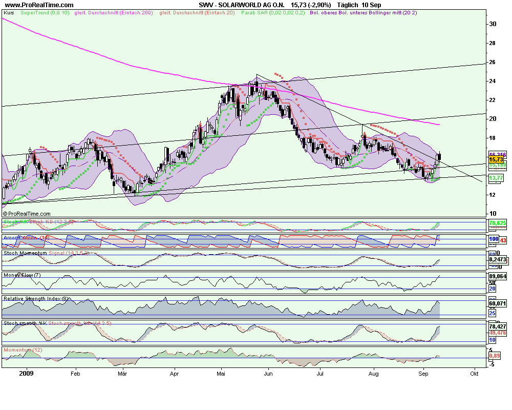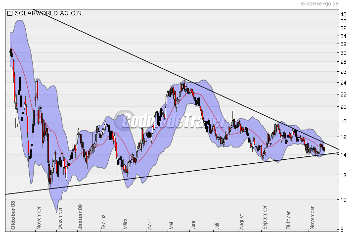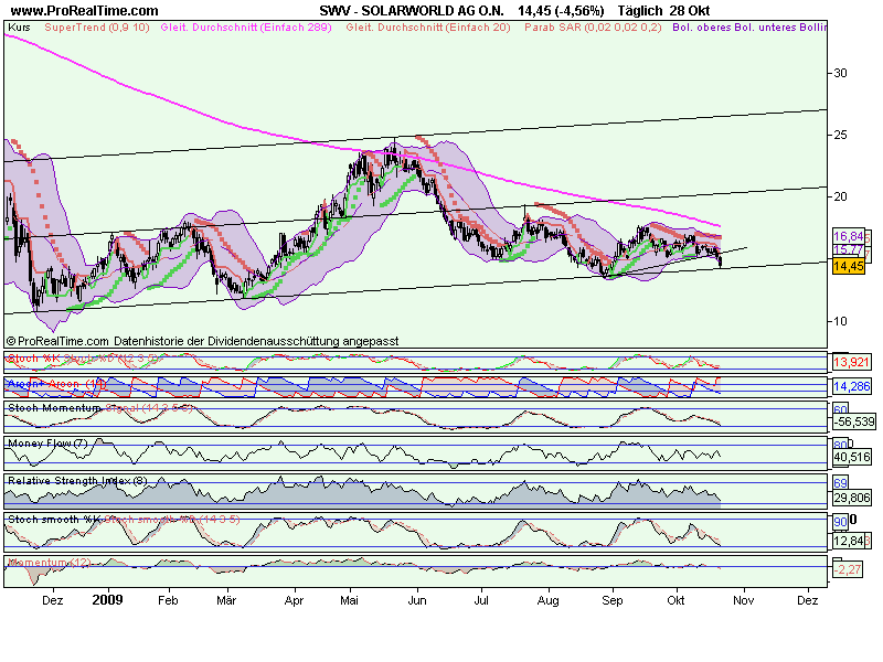 Rückblick: Die Aktie von Solarworld gehört gemeinsam mit Q-Cells zu den schwächsten Solarwerten in 2009. Seit dem Hoch im Mai 2009 bei 24,72 Euro zeigt die Aktie deutliche Schwäche und fällt weit zurück. Eine Erholung vom Zwischentief bei 13,50 Euro aus wurde in den letzten Wochen fast komplett wieder abverkauft.