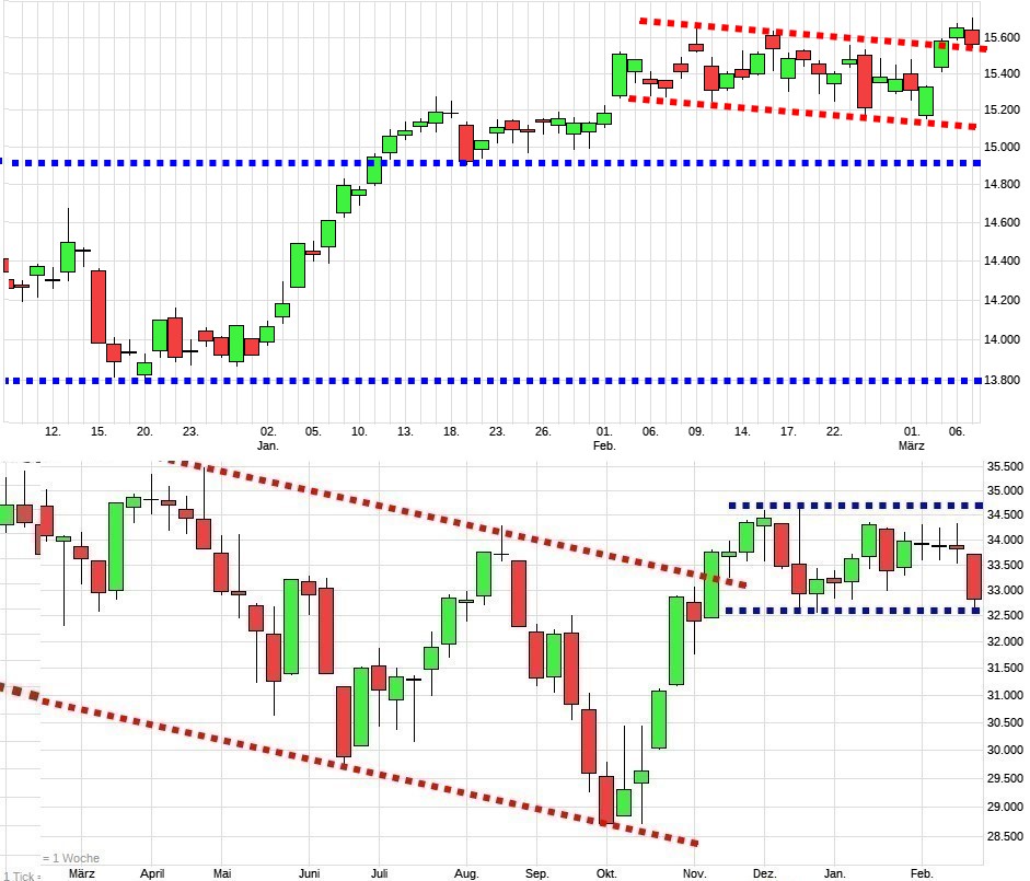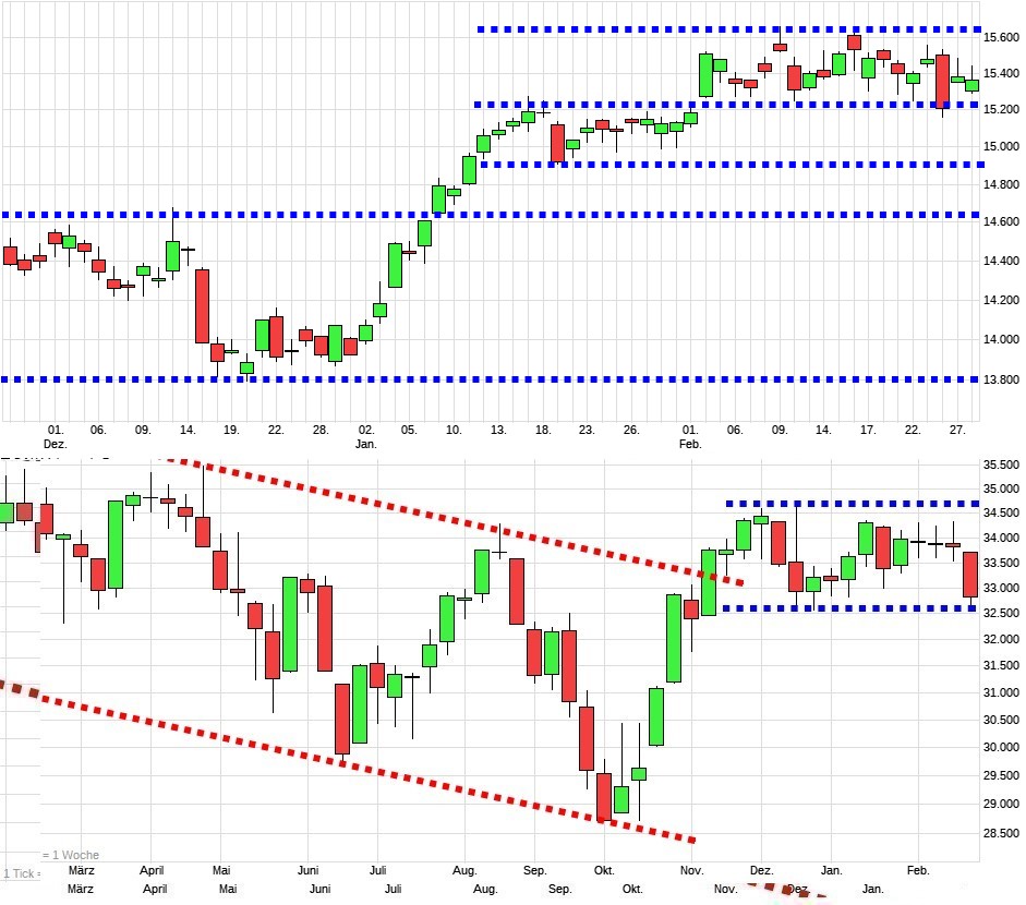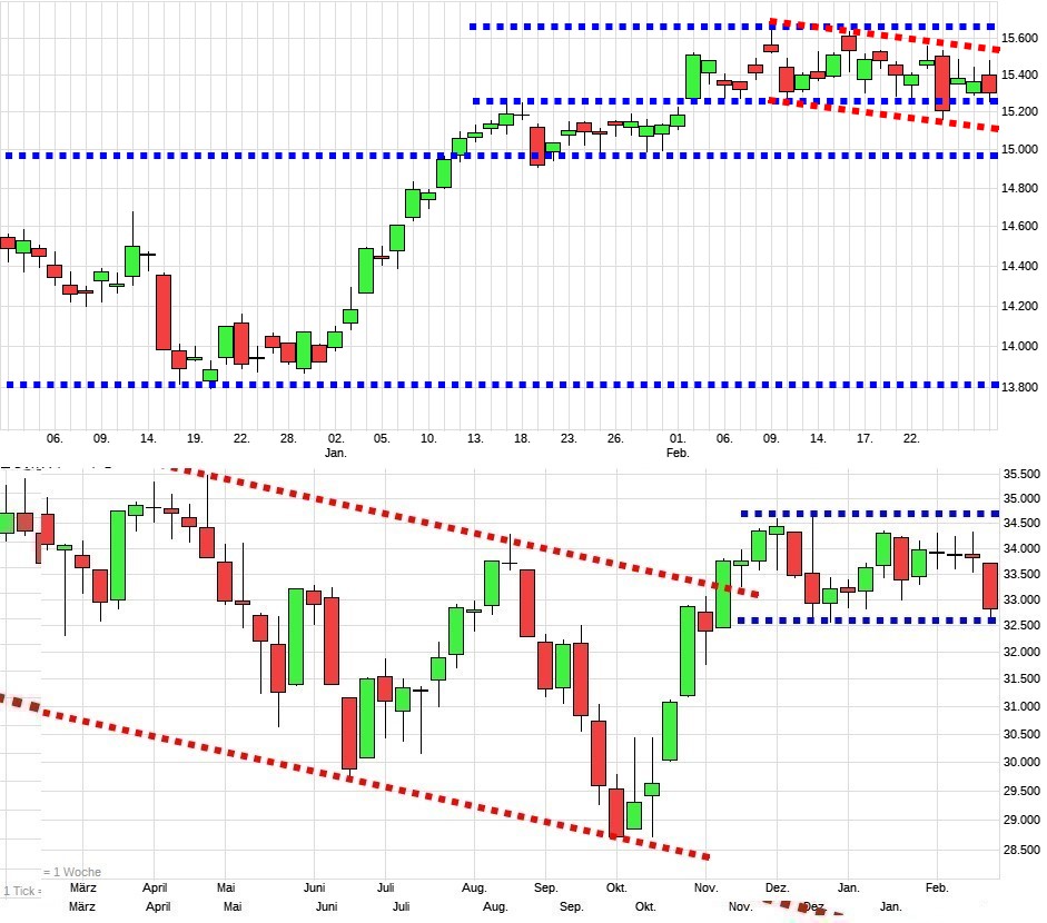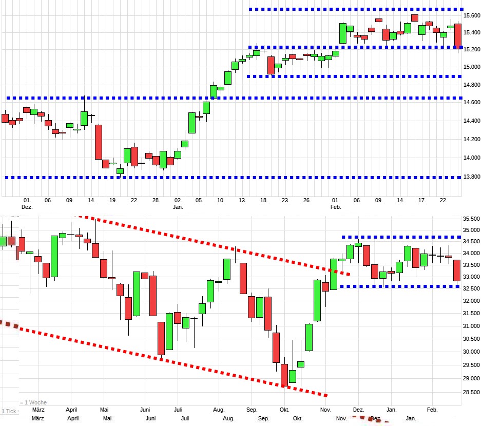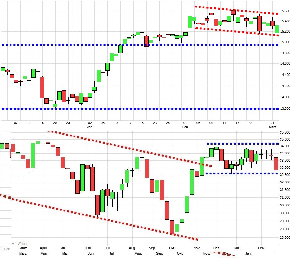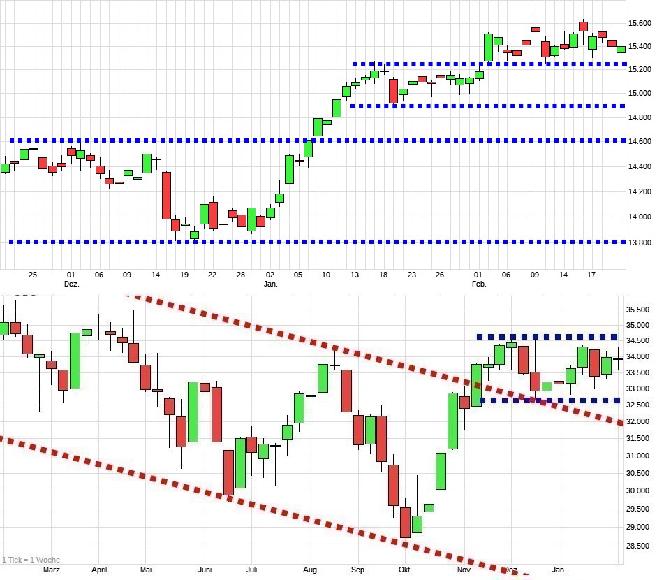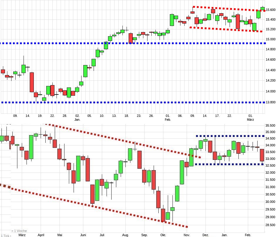 Aber um klar zu sein. Im Moment geben die Charts weder das eine noch das andere her, wobei es nicht ganz stimmt, im DAX gibt es DBWs, die Ziele im Bereich 16+ haben, die Federn gehören aber Projekt 30.