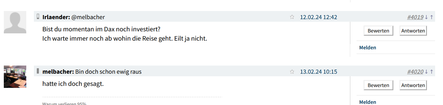 daran wäre nix verwerflich wenn es ct wäre - mit dowtheory hat das aber gar nix zu tun und deine signale sind tatsächlich nicht überprüfbar denn immer dann wenn es spannend wird bist du tage nicht da und kommst dann wie kai aus der kiste im nachhinein und sagst wow - nicht umsonst kommen an hier neuralgischen punkten immer wieder nachfragen die du dann erst tage später oder eben gar nicht beantwortet werden