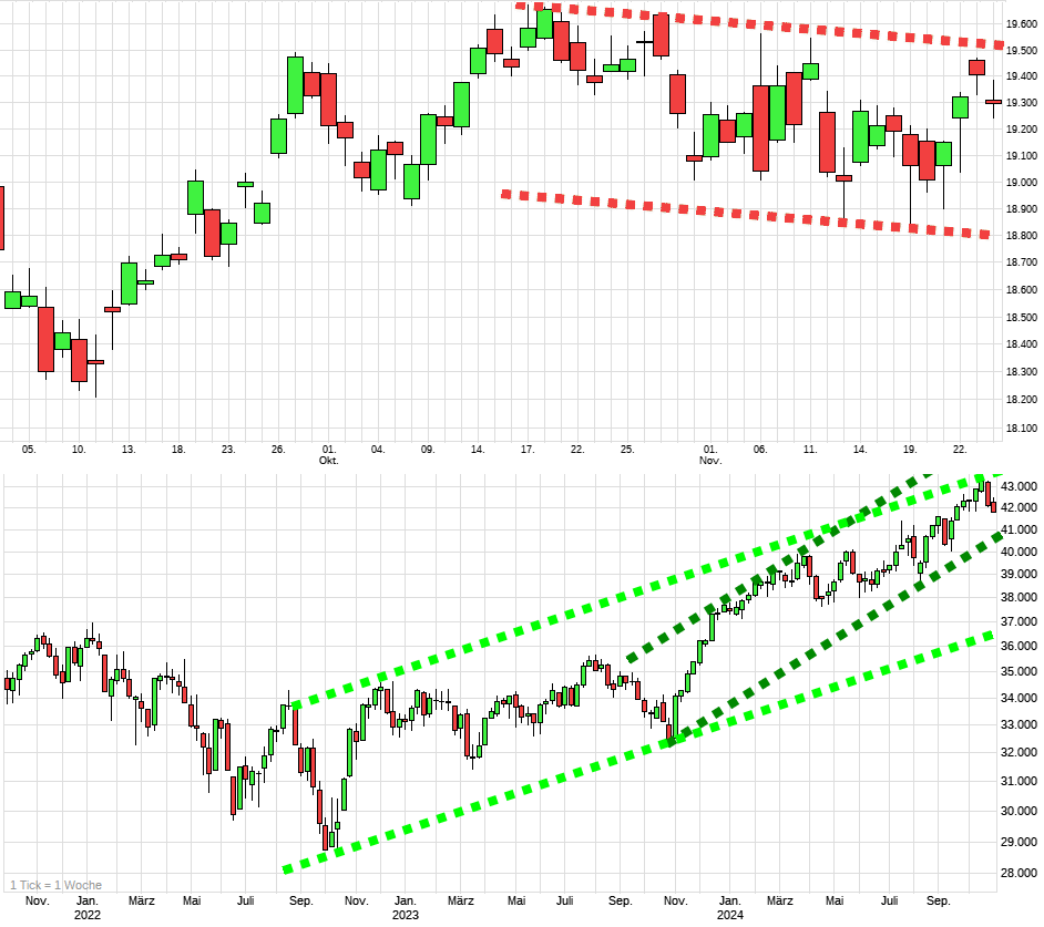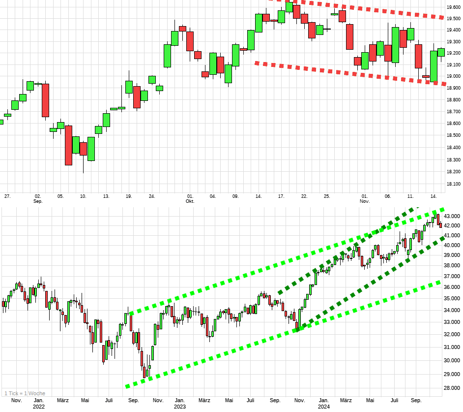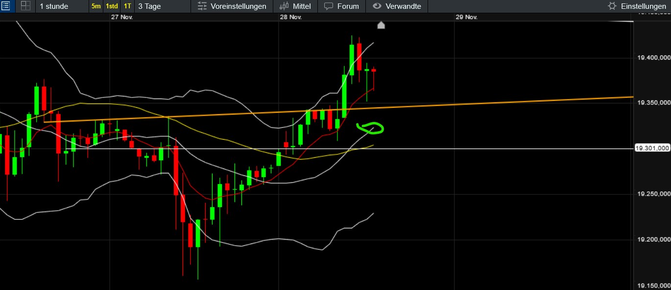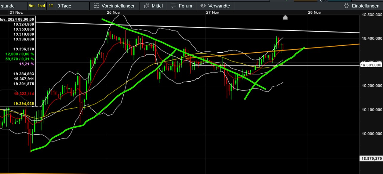 Der bullische Trader könnte das Tief vom 21.11. als den Startschuss für den nun folgenden Aufwärtstrend nehmen. Dann könnte bei überwindung des seichten Abwärtskanals der zweite blaue Pfeil folgen. Daher die Aussage mit den ca. 19700. Ich persönlich sehe eher das Doppeltief vom 19.11. Die Aufwärtsreaktion danach wäre aber nicht so bullisch, da es große Überschneidungen gab. Meine kurzfristige Hoffnung wäre daher ein Abdrehen bei knapp 19600, womit der Weg nach unten wieder frei wäre. Wenn der Dax die 19600 wirklich nachhaltig verlässt, erwarten ja die meisten Analysten doch noch die 20500, dieses Jahr. Daran will mein Kopf aber irgendwie nicht mehr glauben... Jeder kann ja interpretieren, wie er will. Dasa ist ja das Schöne ;-) |