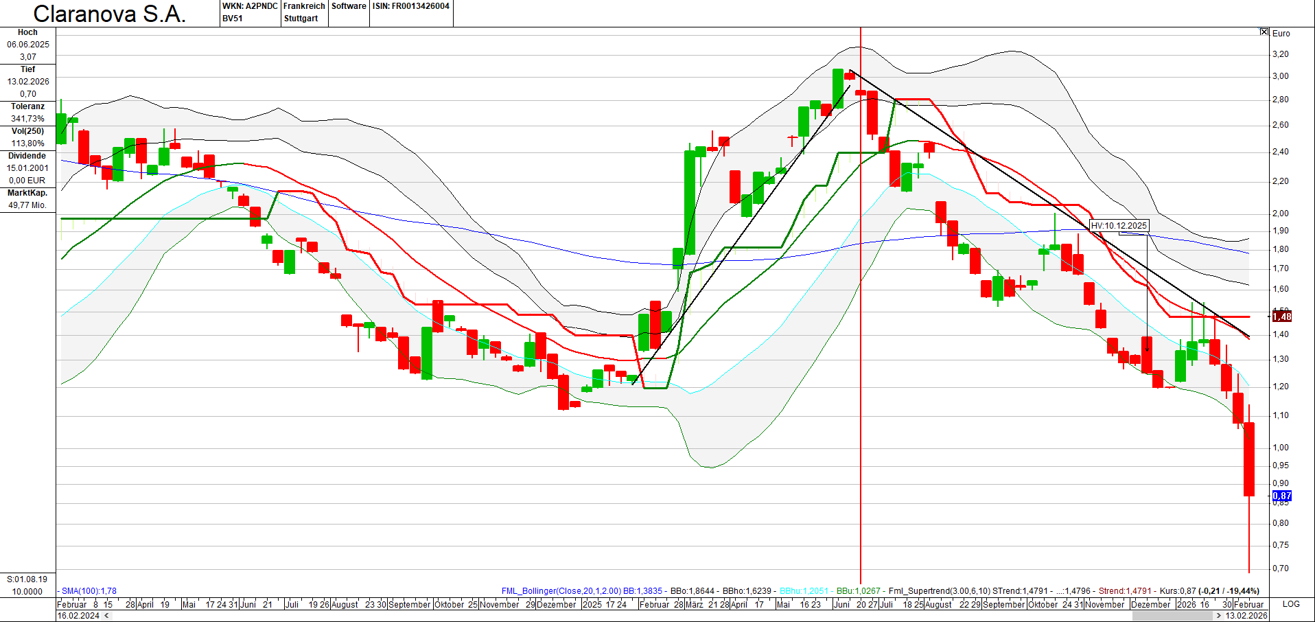 Aber seitdem muss man halt leider konstatieren, das ein großer Teil der Produktpalette von der Konkurrenz überrollt werden könnte, und dieses Thema mit der KI Distruption sich nochmals verschärft hat. Teilweise hätte man das voraus sehen können. Andererseits muss man ja auch sehen, dass der gesamte Softwaresektor 40 % in den letzten sechs Monaten verloren hat. Selbst manche große Software Aktienwerte haben 70 % verloren. Dass Claranova in diesem Umfeld dann besonders kritisch gesehen wird, wundert mich mittlerweile nicht mehr. Aber dass das zu so schnellem Crash führt, war kaum vorauszusehen. Ich habe meine Konsequenzen gezogen, aber das muss sie für sich beurteilen.