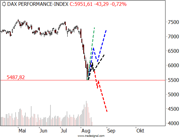 Das blaue Szenario ist das bullishe Normal-Szenario. Es kommt nach dem starken Einbruch zu einer heftigen Gegenbewegung, die ca. 50 % des vorherigen Crashs wieder korrigiert. Es folgt eine Konsolidierung, der ein weiterer dynamischer Aufwärtstrend folgt, der durchaus wieder die Hochs erreicht.