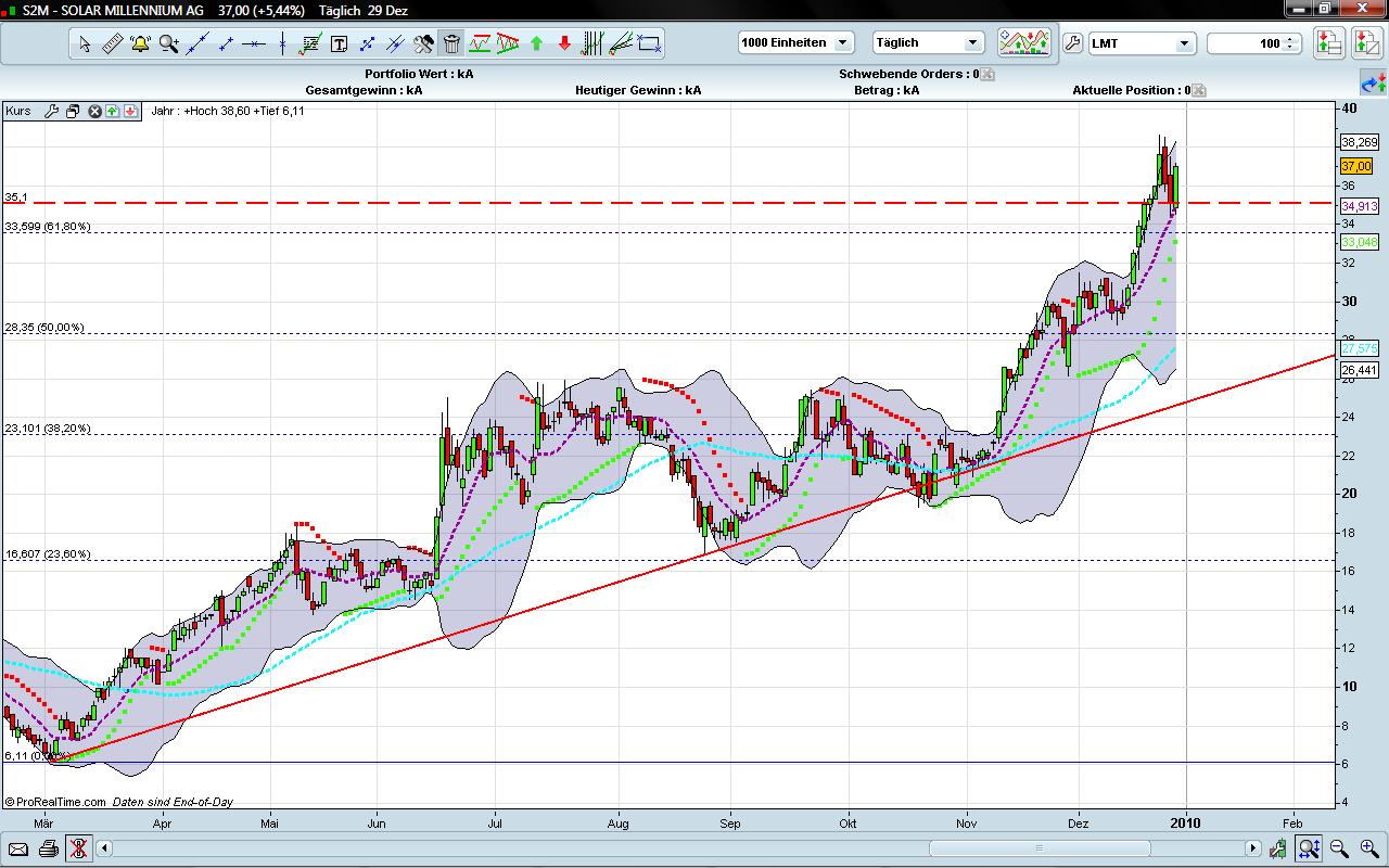 Eigentlich müsste eine Aktie nach einem solch fulminanten Kursanstieg (über 60% seit Threadbeginn Anfang November) etwas länger konsoldieren. Was mich optimistisch stimmt, sind das immer noch recht hohe Handelsvolumina auf XETRA von 2 Mio. € von heute und dass der Kurs auf Intradaybasis einen tollen Rebound hingelegt hat und nur knapp unter dem Tageshoch geschlossen hat. Damit liegt die Aktie schon wieder nur noch knapp unter dem Jahreshoch von 37,60 € aus der Vorweihnachstwoche. Wirklich sehr erstaunlich unsere Solar Millenium-Aktie.