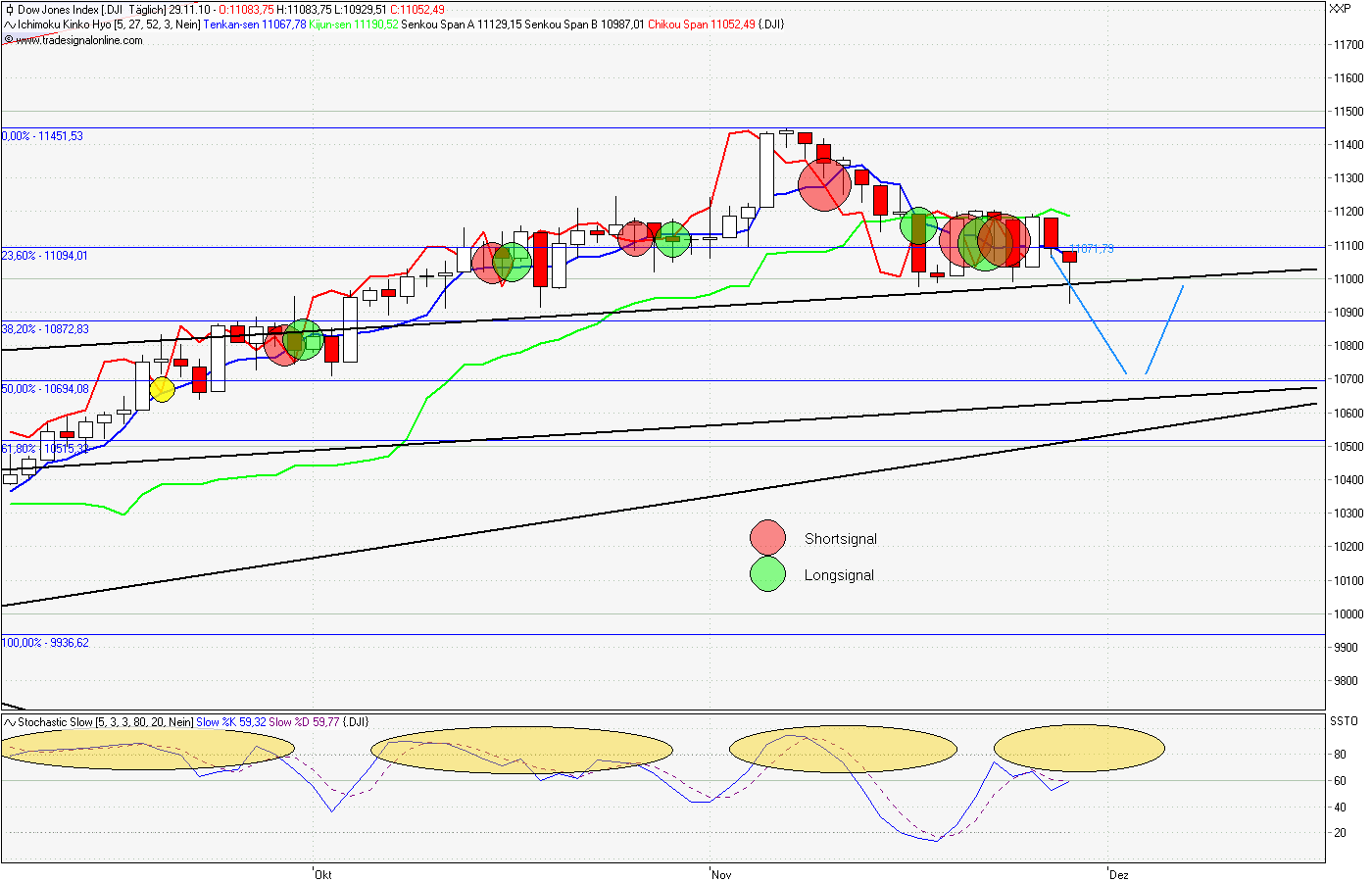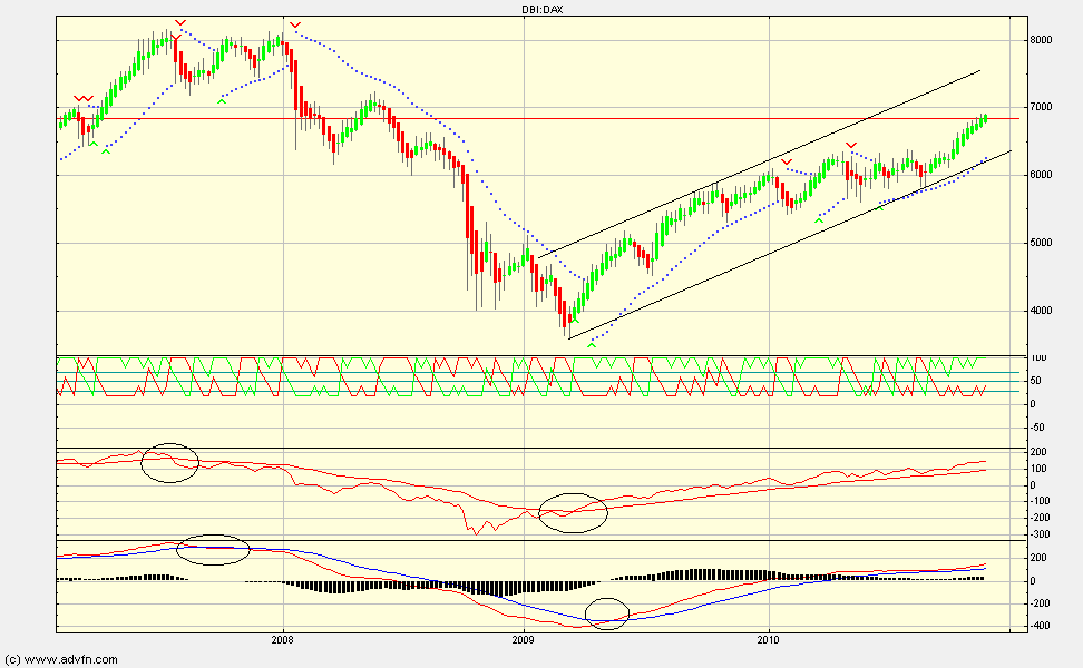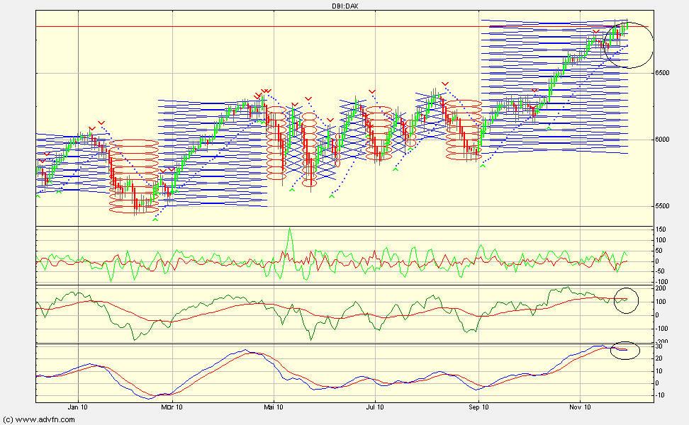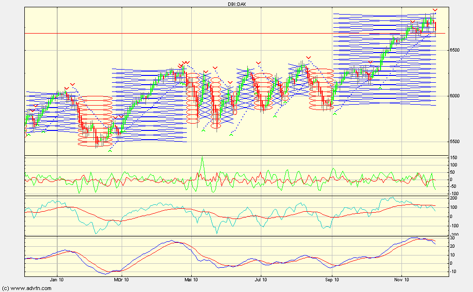 die doch stark abhängt von den verwendeten parametern bei den indikatoren. persönlich stelle ich meine eher "tide" ein - weniger fehlsignale, dafür aber auch nie den hoch- oder tiefpunkt. im detail (siehe chart) sind auf tagesbasis bis dato 2 meiner 5 indi's auf short (die sensibelsten) das wären cci/ma crossover und true strength, der hir-indikator ist der am stärksten oszilliernde (eine beta-version, die ich mal mitlaufen lasse) und ist zwar momentan auf long, wird aber auf grund seiner hohen schwankung von mir nur seltener zum finetuning herangezogen, sar parabolic steht (noch) auf kauf (ansteigende punkte) und wird aktuell bei 6710 gebrochen und lösst ein sell-signal aus, also eng und ein kleines stück drunter, ca. 6680, wird dann auch p&f gedreht, was langsam not tut, denn wir haben hier den grössten "blue-x" körper seit vielen jahren.... fazit: erste position short liegt im markt, pulver bereit und bei eod unter der 6680 wird scharf geschossen..... ( folgend ein kurzer blick auf den wochenchart) |