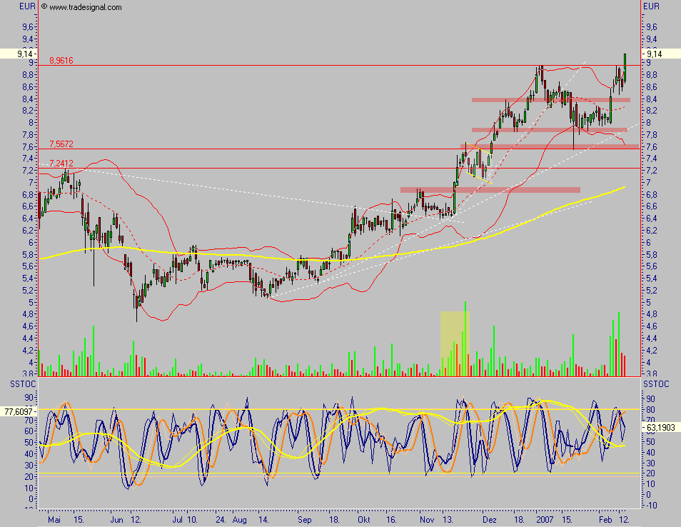 Ein EPS von ca. 0,70 Euro für 2007 könnte mit Übernahme aber drin sein (KGV von knapp 13). Wenn man dann noch hinzunimmt, dass auch für 2008 ein Gewinnwachstum im Bereich 30% in Aussicht gestellt wurde, haben wir ein KGV 2008 von etwa 10.