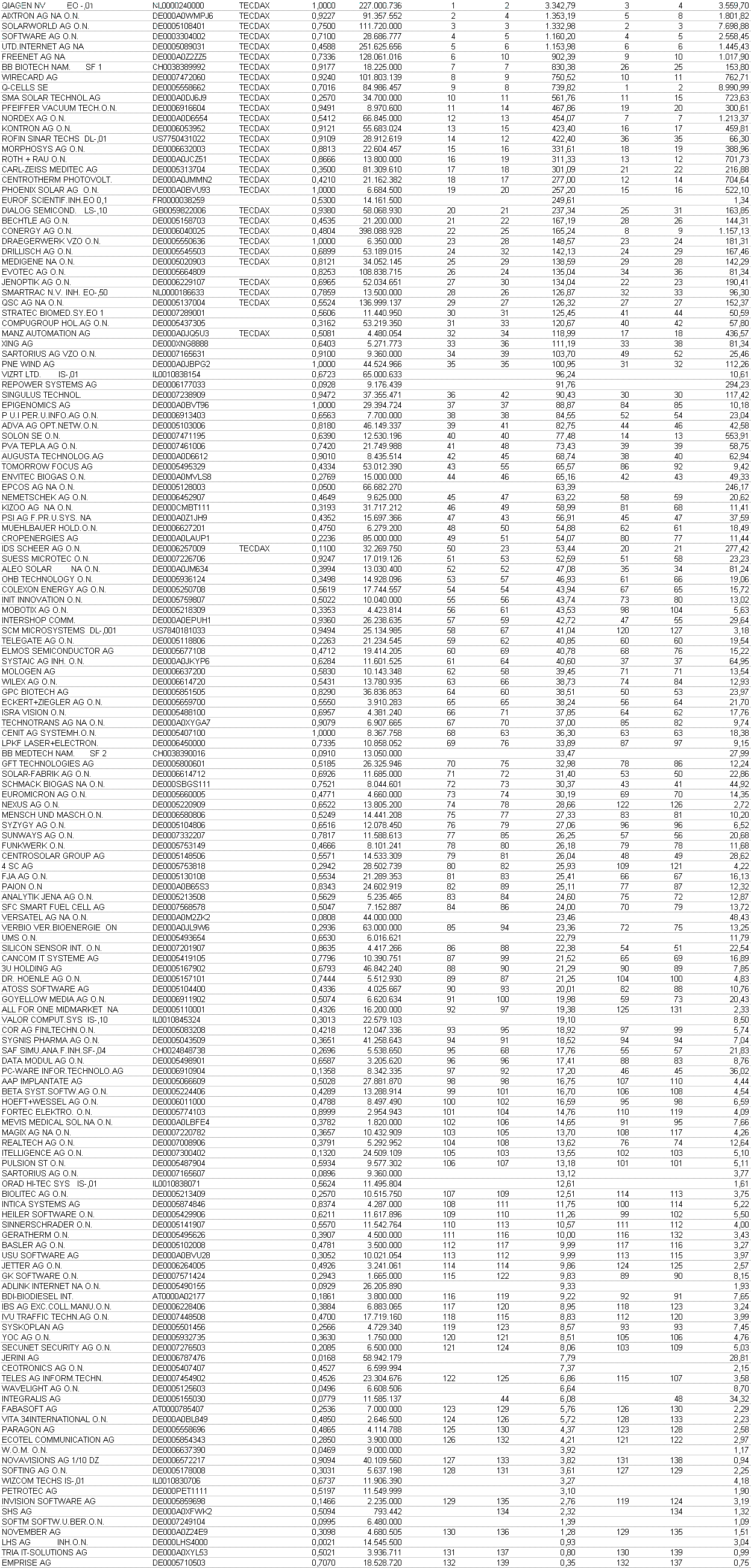 Umsatz sind aber noch die Daten von Ende August. Da dürfte es allerdings auch zu Verschiebungen kommen. Drillisch dürfte sicher QSC, Medigene und Bechtle überholen und dort auf Platz 26 vorstoßen.