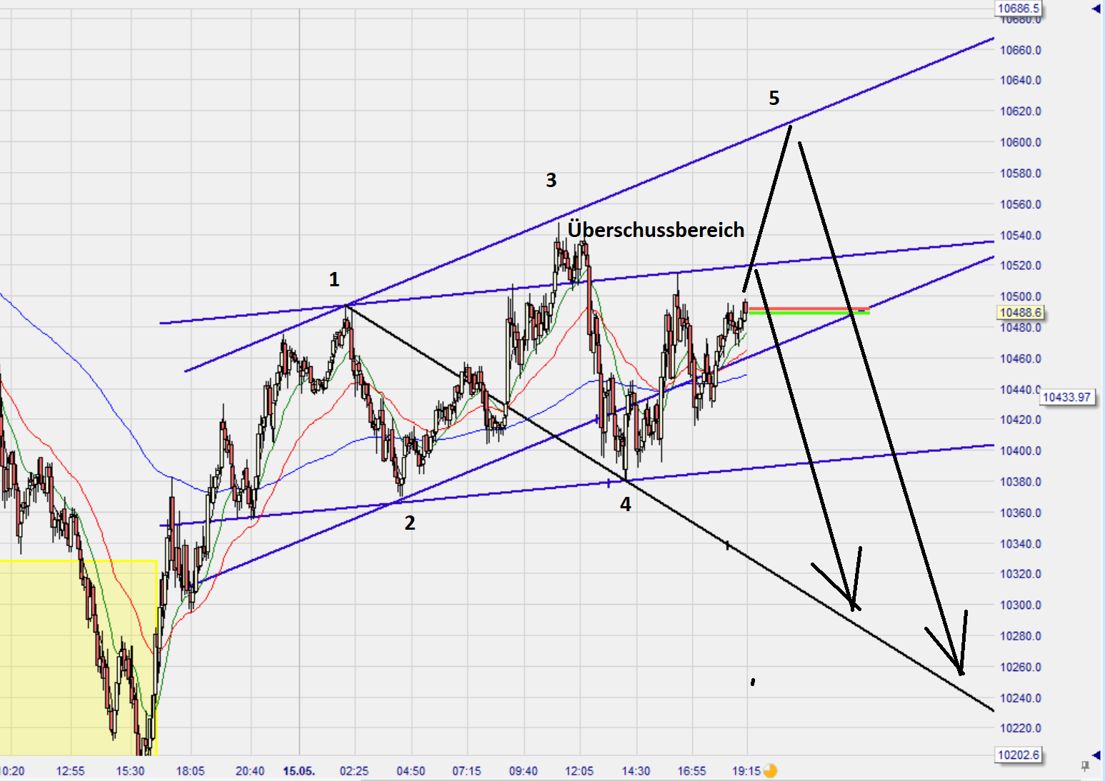 Moin, die 5 ist gemacht. Rein theoretisch kann der Dax noch ein bisschen höher kriechen. Aber über die blaue Linie sollte er nicht drüber gehen. Bisher hat er sich gut dran gehalten, was die wulfe wave bestätigt. Fahrplan weiter die gelbe Zone!
