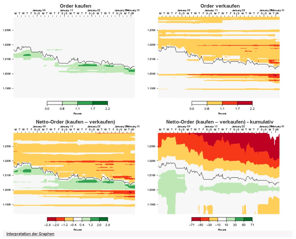 Dort ist normalerweise zu sehen, wie die augenblickliche Verteilung der Limite bei Oanda aussieht. Heute früh war die Mehrzahl aller Sell-Orders (Sell-Stop und Stop-Loss)  ziemlich genau bei 1,198. Das wird nicht billig, wenn die Marke angekratzt wird und alle Retailer auf einmal losfeuern. Kann mir vorstellen, dass es bei anderen Retailern ähnlich gelagert ist.