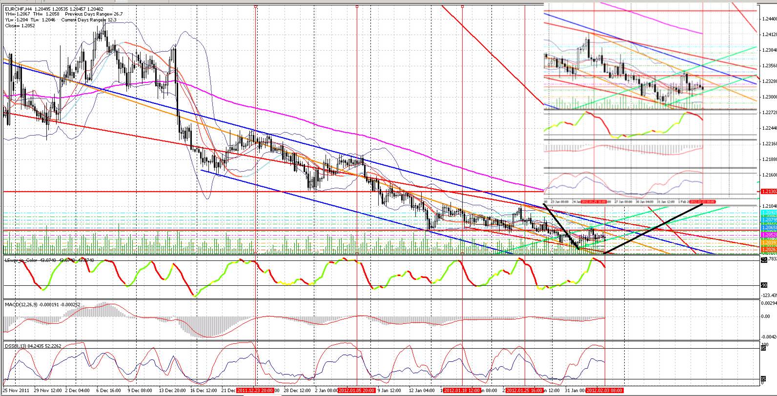 Die 230 (!!) Trader, die derzeit bei FXCM im EURCHF short sind, haben seit dem 20.12.2011 im H4 einen immer noch intakten Abwärtstrend, an deren Oberkante vorgestern ein wenig herumgespielt wurde. Und die Verlautbarungen von gestern hatten offenbear nur gereicht, um innerhalb dieses Trends noch einmal ein Schrittchen seitwärts zu gehen.