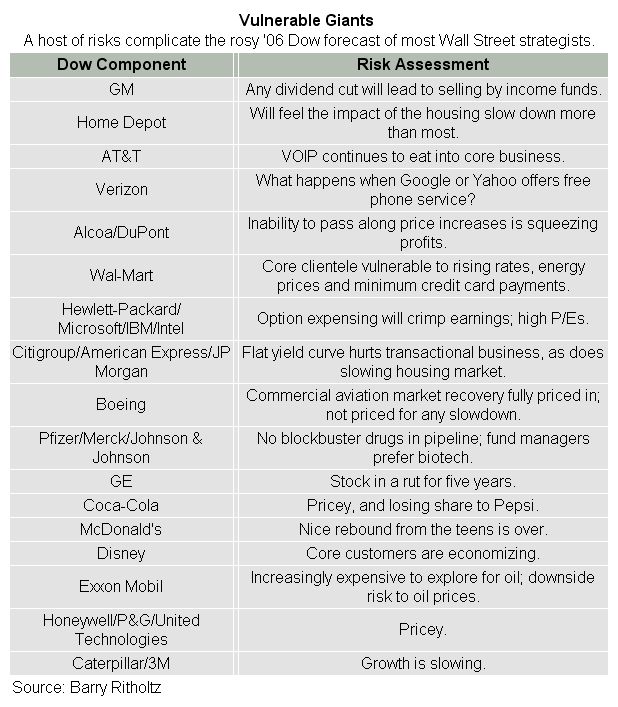 Today we focus on how it could all come together or, as the case may be, come apart. I'll detail how to get to my 2006 target of Dow 6800 -- the lowest (by far) in the Business Week survey -- and lay out a scenario for how the S&P 500 could take a 30% haircut this year.