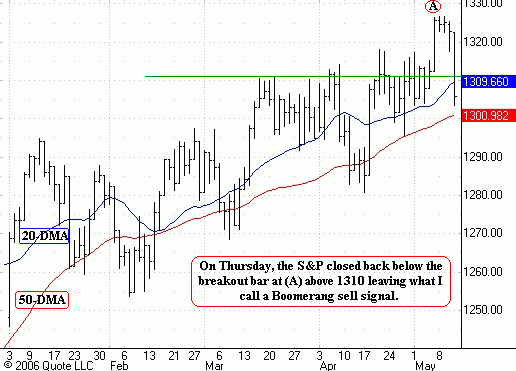 Recently, we talked about the Boomerang pattern in the S&P, stating that a move by the S&P back below the breakout point from last Friday (1310) would trigger a Boomerang sell signal. I went on to say that such a signal occurs when a breakout after a line formation (1295 to 1310 S&P) fails in short order. After last Friday's breakout, the market paused in narrow-range trade for two extremely narrow-range sessions, suggesting an explosion in volatility to follow. That explosion occurred on Thursday.