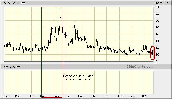 Chart zum VIX: Gestern notierte der VIX noch unter 10 - immer ein Warnsignal. Ein "Ausbruch" der Volatilität nach oben (rot, rechts) kündet meist einen längeren Ausverkauf an. Man beachte im Chart den VIX-Anstieg im Mai 2006 (großer roter Kasten links). Der VIX ist der Volatilitätsindex des CBOE.