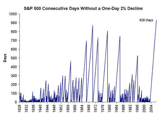 ... I noted my concern that the market hasn't had a significant correction in months. As I was doing some research today, I found an interesting chart, which shows that the S&P 500 has gone more than 928 days since having a one-day decline of 2% or more. That's the second-longest stretch in 53 years, and it clearly illustrates the market's exceptional strength. Unfortunately, it also indicates that we're way overdue for a correction.