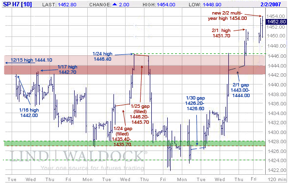 But arguing for a pullback are the multiple gaps below, which are beckoning in the futures. First is the gap from Thursday's up opening, which runs from 1443.00 (Wednesday's close) to 1444.00 (Thursday's low). Well below that one, however, is the gap from Tuesday's opening at 1426.20 to 1426.60. That gap, too, should get filled, though probably not right away.
