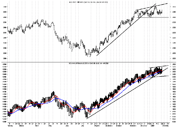 On the upper panel we see the Nasdaq. It's acting even less convincing. It hasn't gone to new highs, and the broadening consolidation is even more apparent. A broadening consolidation after an advance is a historically significant sign of a top.