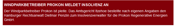 Trotz des großen Zuspruchs und dieses überaus positiven Signals von Seiten der Genussrechtsinhaber, müssen wir Ihnen mitteilen, dass die PROKON Regenerative Energien GmbH heute einen Insolvenzantrag beim Amtsgericht Itzehoe gestellt hat. Das bedeutet allerdings keineswegs das Aus für PROKON. Der Antrag muss zunächst auf seine Zulässigkeit geprüft werden, was einige Monate in Anspruch nehmen wird. Ein vorläufiger Insolvenzverwalter und unsere Berater werden uns in dieser Zeit begleiten. Zum vorläufigen Insolvenzverwalter wurde Herr Dr. Penzlin vom Amtsgericht Itzehoe bestellt. Parallel werden wir unter Einbeziehung der Anregungen unserer Genussrechtsinhaber das Geschäftsmodell anpassen. Wir sind nach wie vor operativ gut aufgestellt und sind zuversichtlich, dass wir die aktuellen Schwierigkeiten überstehen werden. Uns ist klar, dass es Zeit ist, etwas zu verändern!