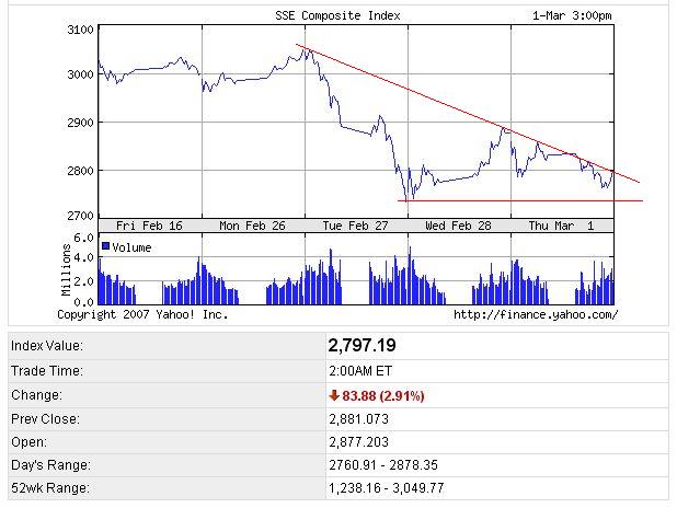 Diese negative Vorgabe dürfte IMHO reichen, um den Shanghai Composite (China), der kurz vor einem weiteren technischen Kollaps steht (unten, möglicher Bruch der Horizontalunterstützung bei 2735), über Nacht erneut auf Talfahrt zu schicken. Die Abwärtsspirale sollte daher IMHO intakt bleiben.