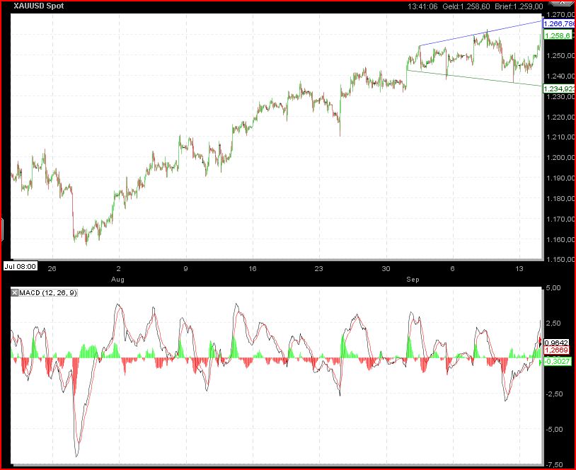 Man könnte jetzt ne Shortposi eröffnen beim Gold und den SL bei 1268 setzen (auch mein SL). Leider bin ich short und hab auch heut früh drauf getippt das es weiter aufwärts geht, meine Positionsgröße läßt den Hochläufer aber zu , trotzdem ist es ein wenig ärgerlich. Kurse über 1268 würden gegen meinen Trade sprechen, ein Dreher bei 1266 allerdings für mich.....