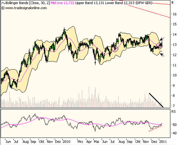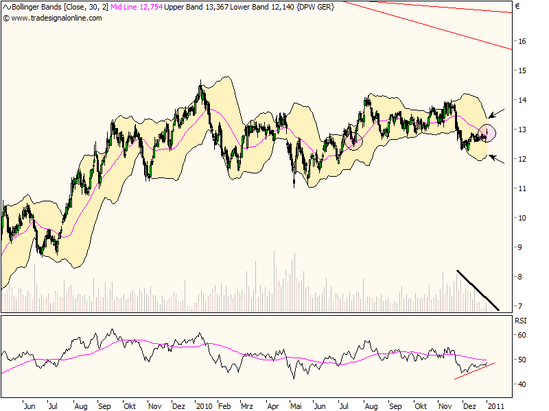 2.) Sich verengende BollingerBands im Zusammenhang mit niedrigen Handeslvolumen (evtl. Grund = Jahresende)