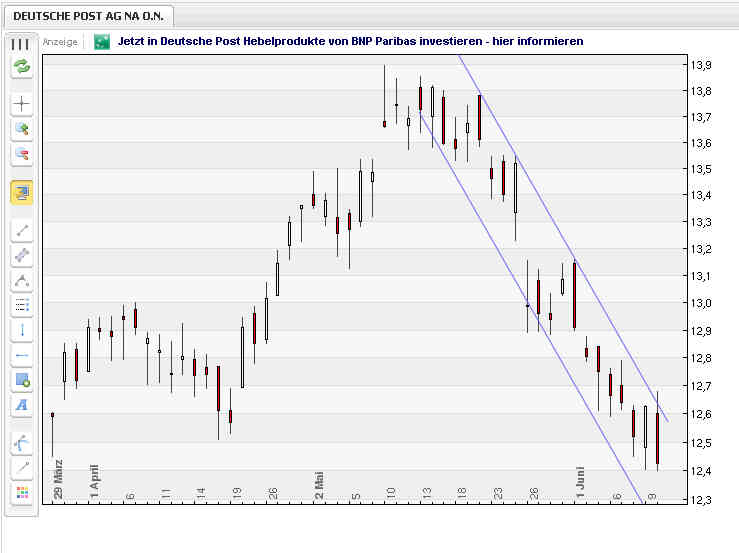 großen Lupe mal den Chart der Deutschen Post AG angeschaut, und komme zu der Erkenntnis, dass die beiden Peaks der letzten Tage ein inverses Doppeltop darstellen. Zumindest kann man das so interpretieren, wenn man die Chartregeln über die Mindestabstände zur Aussagekraft außen vor lässt. Sollte das so sein, so wäre jede weitere Kursentwicklung vorerst nur aufwärts gerichtet und kurzfristige steitwärts Flaggen könnten nur nordwärts aufgelößt werden. Das vorgegebene Kursziel ohne Indexeinflüsse (!) wäre ca 61% des letzten Abverkaufs - das wäre ca 13,15 € dazu kommt jedoch der Einfluss der vom Dax auf jede einzelne Firma wirkt - also steigt der Dax um 5% so müssen die zum Wert der Deutschen Post AG noch addiert werden. 5% vom Ausbruch des Dax bei 7225 macht 7590; da ist auch noch reichlich Platz nach oben. Ich gehe also davon aus, dass wir Kurse "Jenseits von Eden" (15,00 €) sehen werden und zwar noch im Sommer. Dann im Herbst verkaufen und zur Weihnachtsrally den "Strafraum" (16er!) erreichen. Da ich sehr optimistisch eingestellt bin, und auch long bleibe, habe ich vorerst gar kein SL-Order erteilt.