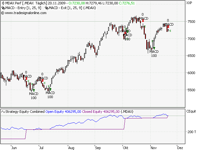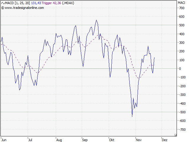 Im Prinzip waren die letzten Signale von TD ganz gut, was aber klar ist, weil wir einen starken Trend hatten. Ich vermute mal, deren MACD muss man nur in Haupttrendrichtung traden um einigermaßen gute Ergebnisse zu bekommen. Ein Vergleich mit meinem HS wäre interessant... Zumindest kann ich nun die Relevanz der Signale von TD ganz gut abschätzen. Insbesondere die Signale gegen den Haupttrend sind also leider nicht sehr sicher. Dem aktuellen Shortsignal messe ich daher wenig Relevanz bei. Nach meinem Gefühl kam das zu schnell, so dicht unter den US-Hochs.