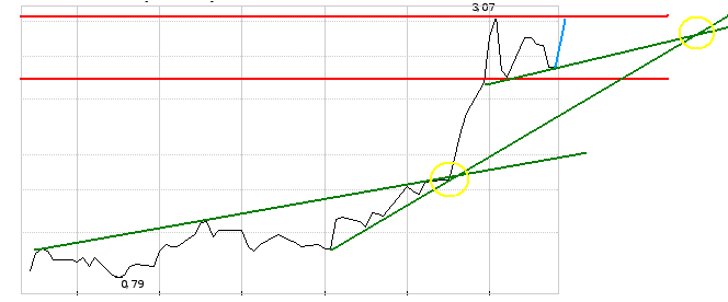 Wir haben eine Widerstandslinie bei 3,06€ Und eine Unterstützungslinie bei 2,24€ (beide rot)