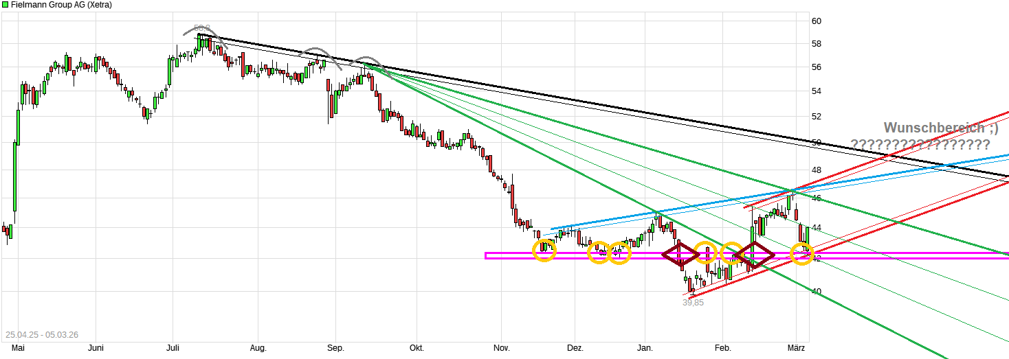 Wichtig ist für mich vorerst was zuletzt verkündet wurde bei den Unternehmenszahlen. Das war erfreulich und gibt hoffentlich dem Kurs weiter die Kraft Richtung "Wunschbereich", d.h. dem seit dem Top von letztem Jahr fallenden Abw.trend. Natürlich ist mir auch klar, daß Börse kein Wunschkonzert ist. Entsprechend ist meine Absicherung hier Positionsreduzierung, falls es doch nachhaltig wieder unter 42€ gehen sollte. Also mal schauen wie sich das "Weel of Fortune" weiter drehen wird und ob Fielmann mit den Q.1 Zahlen weiter die positive Tendenz stützen wird.