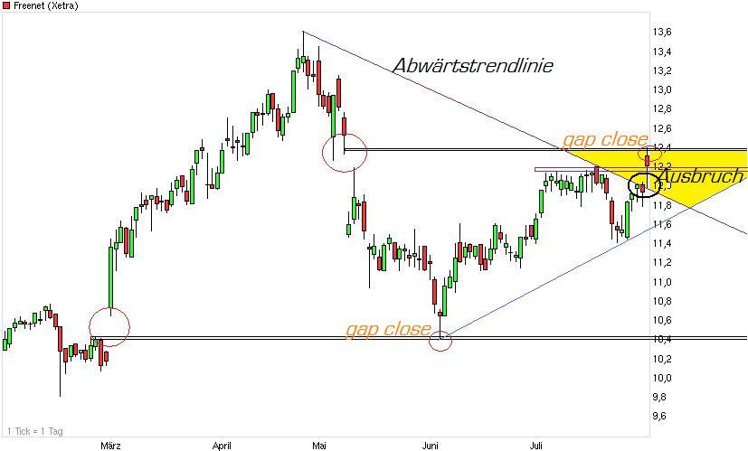 die den Kurssprung ausgelöst hat. Gibt ja genug andere solche Analysen mit ähnlichen Kurszielen und da hat die Aktie auch nicht jedesmal deswegen so einen Sprung gemacht. Zudem ist das 12 Monats- KZ mit 13,5€ nicht so wirklich weit über dem aktuellen Kurs. Wenn die 17 oder 18€ ausgerufen hätten, dann ware es eher erklärbar. Also sieht irgendwie so aus, also ob da ein "Guru" ( die Kulmbacher Börsenmafia trommelt ja schon seit Tagen und hat damit die Lunte gelegt die jemand heute angezündet hat => http://www.ariva.de/freenet-aktie/news) seine Jünger mal wieder alle gleichzeitig mit einer Kaufaufforderung versorgt hätte, damit die alle zu Börsenbeginn blind unlimitiert reinspringen und der Guru dann in bester Scalper Manier auf dem Peak die Shares verkaufen kann die er am Vorabend gekauft hat. Da konnte man auch noch die automatischen Buy Order der chartorientierten Anleger direkt zu Börsenbeginn mit auslösen, um den Peak kurz zu verstärken. Da es keine so wirklich zwingende News gab die den heftigen Ausbruch rechtfertige und zudem ein Eröffnungsgap aufgerissen wurde, ging der aufgescheuchten Herde die frühe Luft aus und man scheint sich jetzt wieder dem Gap-Close zu widmen. Interessant wäre es zu sehen was passiert, wenn das Gap geschossen werden sollte. Wenn dann wieder der Rebound nach oben käme und man sich dann wieder über den horizontalen Widerstand der letzten Zeit bei roundabout 12,20 aufmachen würde auf SK, dann bliebe das frische Chartkaufsignal weiter aufrecht und man könnte durchaus rauf spekulieren, daß es noch weiter läuft Richtung 12,80/85. In dem Bereich läge die 100% Ausdehung des "K " der inversen SKS. ( http://www.godmode-trader.de/wissen/index.php/Chartlehrgang: "...Das theoretische Kurspotenzial entspricht auch bei einer (inversen) SKS-Formation der größten Ausdehnung innerhalb der Formation..." ) . Allerdings wäre es wohl nicht verkehrt, wenn Dragi morgen auch "liefert" was der Markt sehen will. Andernfalls könnte es nochmal heftig rumpeln am Gesamtmarkt und Freenet sich dann wohl kaum ohne frische fundamentale News so einem Sog entziehen. SL würde ich momentan setzen knapp unterhalb der Nackenlinie der SKS oder unterhalb der unteren blauen Trendkanalbegrenzung