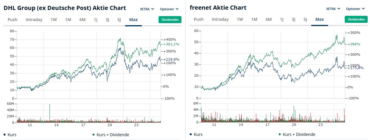 Mal angenommen, man hätte vor langer Zeit in Deutsche Post (später DHL) und Freenet investiert, dann wäre aktuell der reine Kurswert der DHL Aktien deutlich besser,  mit Dividenden + Kurswert gerechnet wäre Freenet knapp besser, hätte man die DHL- und die Freenet-Dividenden jeweils in die gleiche AG reinvestiert, dürfte Freenet einen deutlichen Vorsprung der Gesamtrendite erbracht haben (um es genau zu beziffern müßte man eine kleine Tabelle mit den historischen Dividenden und Kursen füttern).