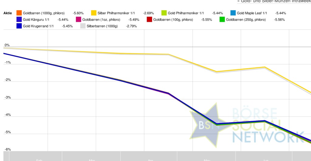 ""In der Wochensicht ist vorne: Silber Philharmoniker 1/1 -2,69% vor Silberbarren (1000g) -2,79%, Gold Känguru 1/1 -5,43%, Gold Maple Leaf 1/1 -5,43%, Gold Philharmoniker 1/1 -5,43%, Gold Krugerrand 1/1 -5,45%, Goldbarren (1oz, philoro) -5,48%, Goldbarren (100g, philoro) -5,54%, Goldbarren (250g, philoro) -5,57% und Goldbarren (1000g, philoro) -5,6%.