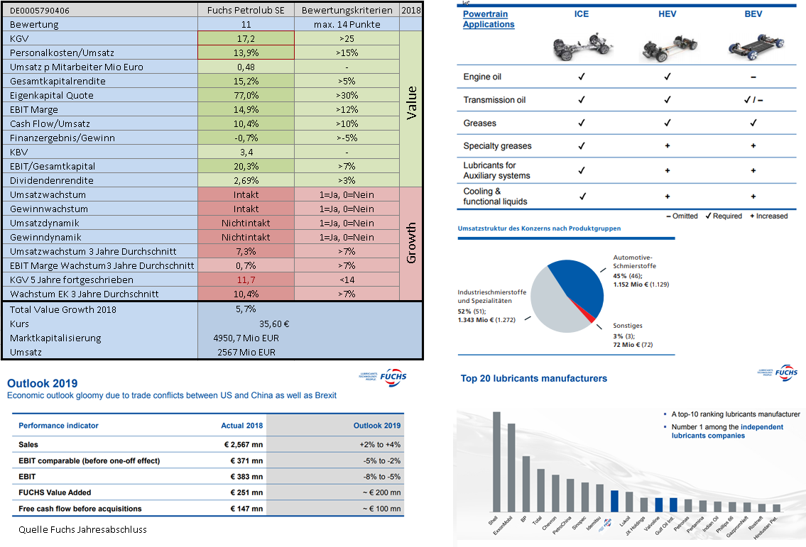 In diesem Thread soll es um eine fundamentale Betrachtung der Fuchs SE 2018 und die Gefahren und Chancen der E-Mobility gehen. Fuchs hat seine Bilanz für das Gesamtjahr 2018 veröffentlicht und dazu einen Ausblick für 2019 gegeben. Wie sind diese Zahlen zu bewerten auch mit Hinblick auf das Geschäftsfeld Motorenöle und die anstehenden Kraftfahrzeugs- Elektrifizierung. Zu Fuchs Fuchs generiert seinen Umsatz alleine aus dem Verkauf von hochwertigen Ölen. Dazu zählen neben den Motorenölen noch Hydraulik-, Getriebe- und Kältemaschinenöle. Fuchs Kernkompetenz liegt in der Veredelung der Öle mit hochwertigen Additiven zum Schutz der geschmierten Bauteile. Fuchs ist der größte unabhängige Schmierstoffhersteller der selbst kein Rohöl fördert. Mit Blick auf die Elektrifizierung erwartet Fuchs ein Rückgang im Bereich der Motoren- und Hydrauliköle bei gleichzeitig höherem Bedarf im Bereich Fette und Thermoöle für Kühlung des Powertrain und Schmierung von Zusatzsystemen im Fahrzeug. Im Bereich Kältemaschinenöle ist Fuchs der Marktführer, zumindest in Europa. Im Dezember hatte ich die Gelegenheit mir von der Produktion in Mannheim selbst ein Bild zu machen. Die Stammaktien sind mehrheitlich noch in der Hand der Familie Fuchs die in beiden Organen vertreten ist. Der Aufsichtsrat ist mit 4 Mandatsträgern der Kapitalseite und 2 der Arbeitnehmer besetzt, ein Vorteil den die SE hier mit sich bringt. Bewertung Bewertet wird Fuchs mit einem KGV von 17 momentan recht günstig bewertet. Der Benchmark Chemiesektor Europa kommt auf 24. Rentabilität Fuchs kann hier zuerst mal mit niedrigen Personalkosten glänzen, 13,9% vom Umsatz wird hierfür aufgewendet. Der Chemiesektor liegt hier bei 20% und hat damit deutlich höhere Kosten. Der Einfluss spiegelt sich auch direkt beim EBIT wieder. Die EBIT Marge liegt bei 15% zu 13% des Chemiesektors. Finanzlage Die Eigenkapitalquote liegt bei 77% und der Cashflow bei 10,4%. Das geht eigentlich nicht besser. 2/3 des Ertrags gehen als Cash zurück ins operative Geschäft. Die Abzinsung für aufgenommenes Fremdkapital ist vernachlässigbar. Die Dividende von 2,7% kann problemlos aus den liquiden Mitteln gezahlt werden. Wachstum Sowohl Umsatz als auch Gewinn wachsen kontinuierlich in den letzten Jahren. Der Umsatz kann jährlich um durchschnittlich 7% gesteigert werden das Eigenkapital der Aktionäre wächst sogar um 10%. Ausblick Für 2019 gibt Fuchs einen relativ zurückhaltenden Ausblick. Der Umsatz soll zwischen 2 und 4 % wachsen, beim EBIT erwartet mal sogar einen leichten Rückgang wegen bevorstehender Investitionen in Fabriken, Personal, Entwicklung und IT-Infrastruktur. Das gerade IT- und Personalkosten in Deutschland die letzten Jahre stark gestiegen sind, trägt hier sicherlich mit dazu bei. |
