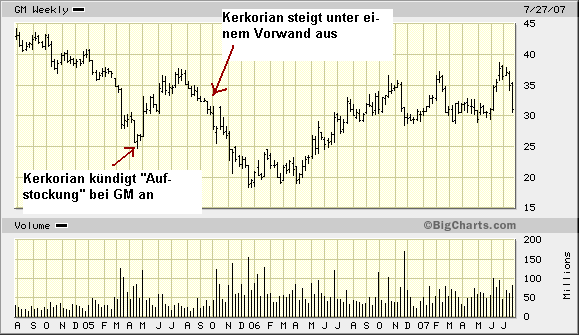 Die Aktie stand zu der Zeit bei 25 Dollar. Sofort begannen alle Shorts, sich panikartig einzudecken. GM stieg in wenigen Tagen auf über 30 Dollar. Einige Monate später jedoch, im November, VERKAUFTE Kerkorian unter einem Vorwand seine GM-Aktien und kam auf einen Ausstiegskurs von 33 Dollar: