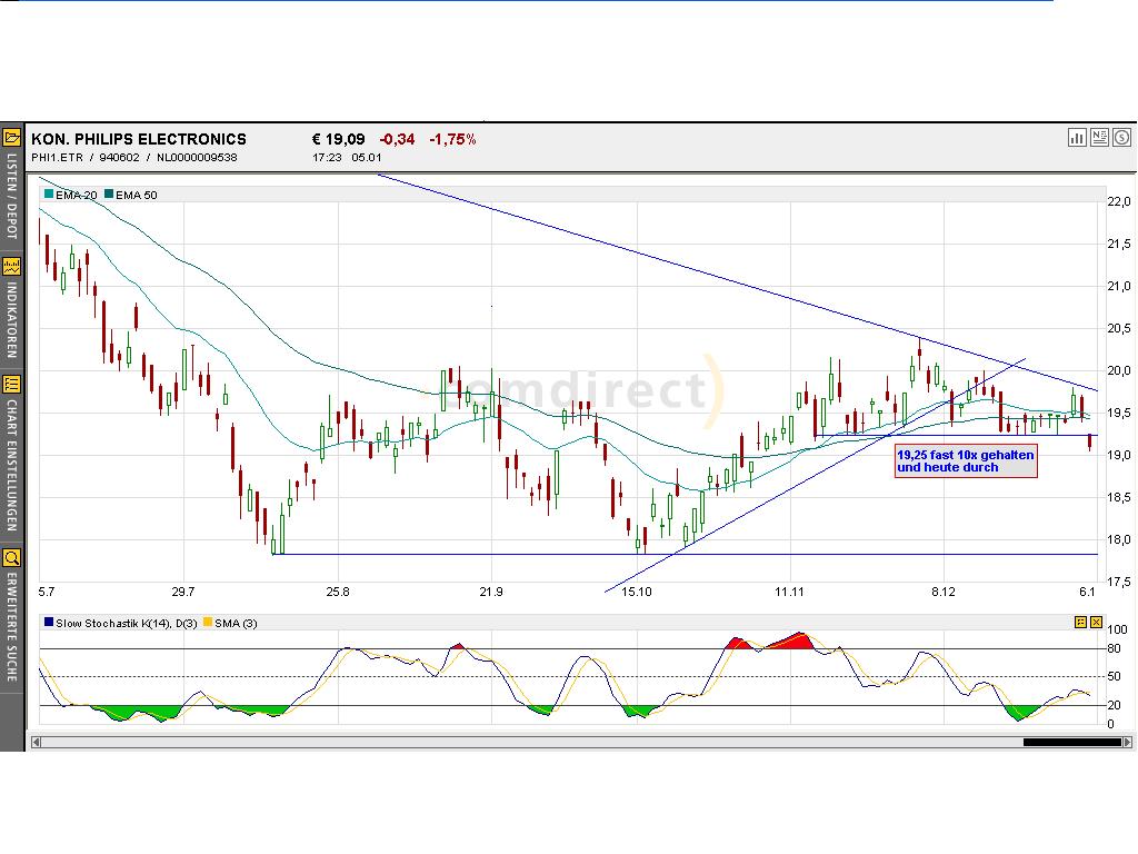 | Das niederländische Elektronik-Konglomerat Philips Electronics hat im abgelaufenen Quartal einen Gewinn von 616 Millionen Euro oder 48 Cents pro Aktie erzielt. Im Vorjahreszeitraum waren lediglich 3 Cents pro Aktie übrig geblieben. Die Umsätze stiegen um 11 Prozent auf 7,3 Milliarden Euro.Wie das Unternehmen mitteilte, war der deutliche Gewinnanstieg von einer Erholung der Chip- und Konsumelektroniksparte getragen. Daneben waren 251 Millionen Dollar vom LCD-Bildschirm-Hersteller LG Philips zugeflossen. Das gemeinsam mit der koreanischen LG Electronics betriebene Unternehmen dürfte diese Woche in New York und Seoul an die Börse gehen. Für die Sparte Konsumelektronik erwartet Philips im laufenden Quartal allerdings weitere Restrukturierungsaufwendungen in Höhe von 30 Millionen Dollar. Im Bereich Medizintechnik will man noch in diesem Jahr eine Bruttomarge von 14 Prozent erreichen.Die Philips-Aktie kann sich in New York um aktuell 0,73 Prozent auf 26,25 Dollar verbessern. |