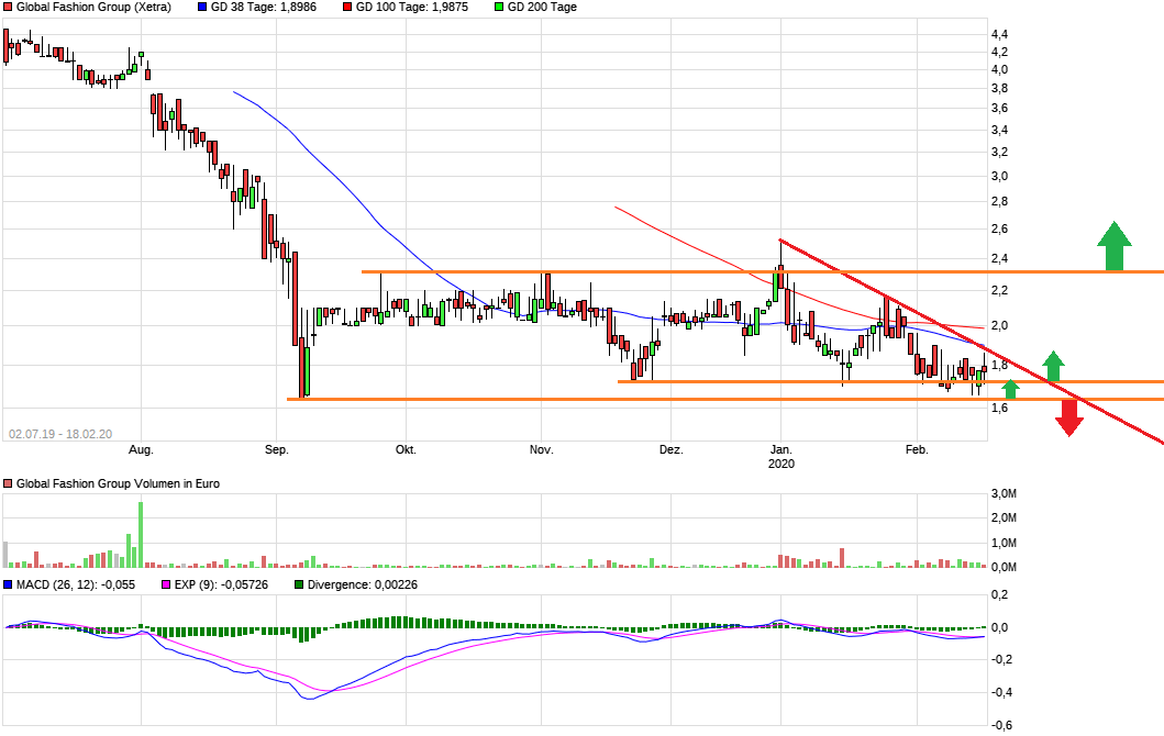 Nach oben hin dürfte man erstmal Potenzial bis 2,3-2,4 € haben, also Oberseite der Seitwärts-Range.