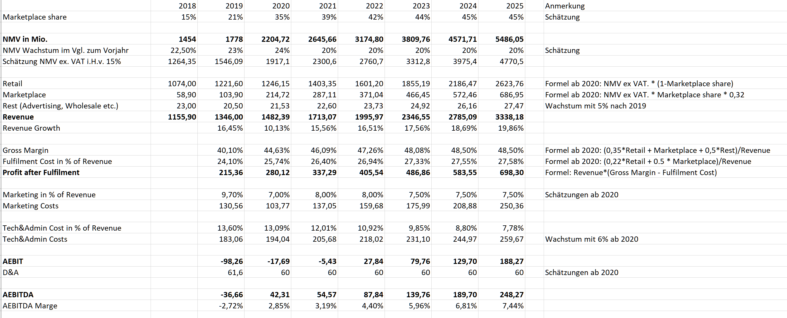 Bin über konstruktive Kritik sehr froh und erkläre auch meine Gedankengänge, falls es Fragen zu den Schätzungen gibt. Insbesondere bei Marketing sowie Tech&Admin Costs war ich mir unschlüssig, wie sich das in Zukunft entwickeln wird. Die dazugehören %-Werte für das Jahr 2019 habe ich aus dem GB und/oder aus Präsentationen entnommen. Das AEBIT und AEBITDA geht sich mit den berichteten Werten von GFG nicht ganz auf, es liegt wahrscheinlich daran, dass die %-Werte bei den Fulfilment, Marketing und Tech&Admin Costs auf die erste Nachkommastellen für das Jahr 2019 seitens GFG gerundet wurden.