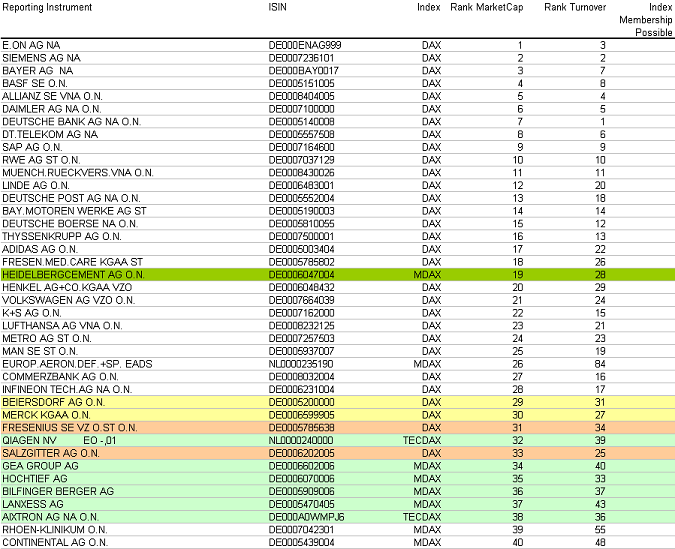 tja, HeidelbergerCement hätte das Entry-Kriterium (30/30) zwar erreicht, aber leider dürfte noch kein Absteiger bereitstehen. Wackelkandidaten wären vor allem Salzgitter (Platz 33 nach MK) und Fresenius (Platz 34 nach Umsätzen). Da müsste sich also bis Ende Februar noch was zugunsten der Heidelberger tun. Schaun wa mal. Morgen dürfte erstmal die nächste Rangliste zu Dax und Co rauskommen. Ich erwarte HeidelbergerCement dabei auf den Plätzen 21 (MK) und 28 (Börsenumsatz).