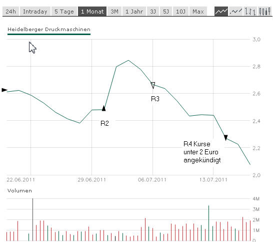 am Mittwoch 06.07.2011 habe ich geraten * verkaufen. Dass es so knüppeldick kommt, hat sogar mich überrascht. Das Management macht weiter auf positiv. Wir haben ein Vor Drupa Jahr! Im ersten Quartal schon wieder ein Minus bei den Kennzahlen. Glaubt man im Vorstand ernsthaft daran dass die nächsten Quartale besser verlaufen? Vor Drupa Jahre waren schon immer geprägt von rückläufigen Auftragseingängen. Heidelberg braucht eine Kahlschlag im nicht produktiven Bereich. Tagtäglich werden hochkomplexe Planungssysteme eingesetzt, verwaltet und weiter projektiert. Mit NULL Nährwert., aber riesigem personellem Aufwand und Kosten.