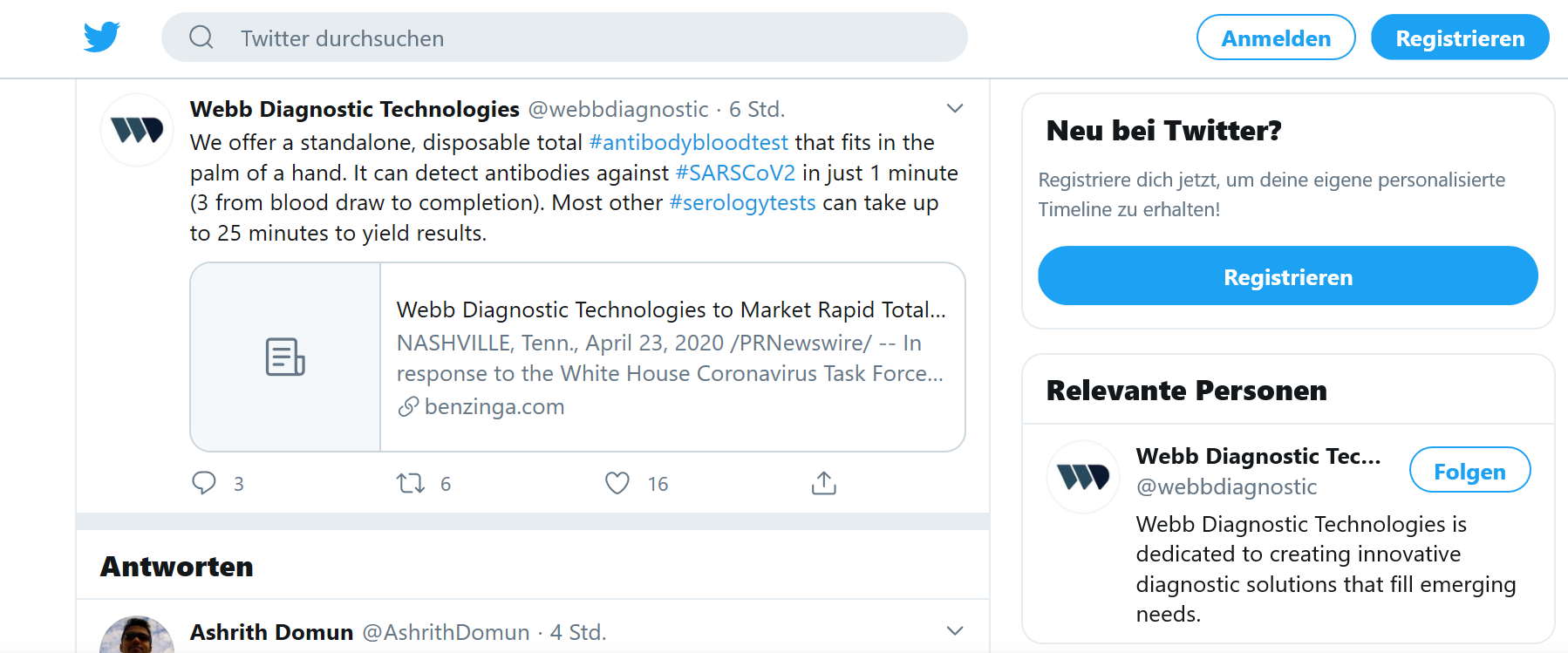 "Webb Diagnostic Technologies (www.webbdx.com) hat ein umfangreiches Verkaufs- und Marketingteam aufgebaut, das unser Geschäft mit Sicherheit vorantreiben wird. Wir freuen uns, diese für beide Seiten vorteilhafte exklusive Partnerschaft zu sichern und diesen hochwertigen, tragbaren Antikörpertest auf den US-Markt zu bringen", sagte Hermes Chan, CEO von MedMira. "Da die Nachfrage nach zuverlässigen SARS-CoV-2-Antikörpertests wächst, ist diese Vereinbarung der erste Schritt, um unsere bewährte Diagnostikplattform mehr medizinischen Fachkräften in den Vereinigten Staaten zugänglich zu machen".