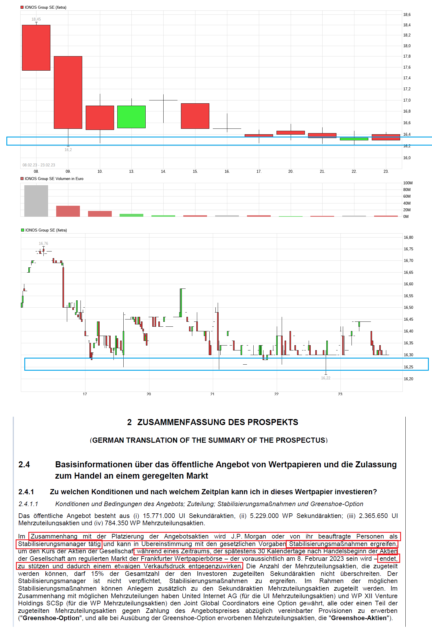 Ist hier jetzt seit einigen Tagen der Stabilisierungsmanager (J.P. Morgan?) unterwegs, um den Kurs im Bereich um 16,30 vor weiterem Kursverfall zu schützen? Also das könnte ja jetzt 30 Tage so gehen, wenn man in den IPO Prospekt schaut, falls nicht vorher von selber wieder mehr Kaufinteresse käme, um den Kurs anzuheben. Das Handelsvolumen entspricht inzwischen nurnoch einem kleinen Bruchteil dessen was an den ersten Handelstagen zu sehen war, wo der Greenshoe-Überhang schnell in den Markt gedrückt wurde, weil schon beim Bookbuilding zuvor die Nachfrage so gering war, daß der Greenshoe dort nicht zu platzieren war. Im Ionos IPO-Prospekt steht ja folgendes: "....Im Zusammenhang mit der Platzierung der Angebotsaktien wird J.P. Morgan oder von ihr beauftragte Personen als Stabilisierungsmanager tätig und kann in Übereinstimmung mit den gesetzlichen Vorgaben Stabilisierungsmaßnahmen ergreifen,um den Kurs der Aktien der Gesellschaft während eines Zeitraums, der spätestens 30 Kalendertage nach Handelsbeginn der Aktien der Gesellschaft am regulierten Markt der Frankfurter Wertpapierbörse – der voraussichtlich am 8. Februar 2023 sein wird – endet,zu stützen und dadurch einem etwaigen Verkaufsdruck entgegenzuwirken. .."