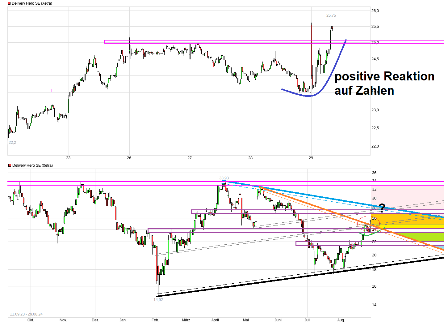 In Asien tut man sich wie erwartet weiterhin schwer, da dort auch die Konkurrenz größer ist. Deswegen hat man ja einen Teil des Asien-Geschäfts jüngst verkauft (Foodpanda-Geschäfts in Taiwan). Aber andere Regionen auf der Welt gleichen das scheinbar wieder aus. Und wenn in Q.4 der Talabat IPO mit 5 Mrd. bewertet würde, dann würde das noch deutlicher die Sum-Of-The-Parts aufzeigen. Von daher hoffe ich mal die morgendlichen Gewinne von heute nach den Zahlen werden nicht wieder zu schnell aufgefressen, wenn dann auch die US-Boys ab 15:30 mit ins Rennen gehen. Zudem muß man auch mal abwarten was auf dem Conference Call noch alles geäußert wird in der Q&A Runde. Was vielleicht bei manchem schon wieder in etwas Vergessenheit geraten ist, daß ist die ausstehende Kartellstrafe.( https://www.ariva.de/news/...ellbue-knnte-400-millionen-euro-11299194 ). Das ist natürlich auch so ein Damokles-Schwert was etwas im Schatten noch da wäre. Bin gespannt wann da die Verfahren zu einer finalen Strafe dann führen werden und in welcher Höhe. Von Chart her wäre mein Wunsch, der Schwung trägt den Kurs jetzt erst einmal noch etwas weiter bis in die Region von ca. 27,5o/28,00 Euro, wo wieder die nächsten Hürden liegen ( z.B..seit Anfang April fallende blaue Abw.trendlinie.) Dafür sollte möglichst auch im Hintergrund die Gesamtbörsenstimmung weiter mitspielen.