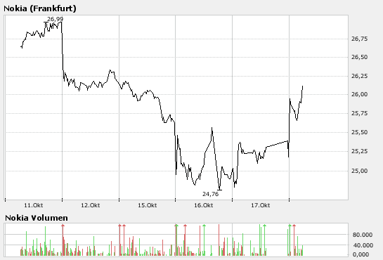 Nokia habe für das dritte Quartal bei schwachen Umsätzen gute Gewinne gemeldet, da die starken Handy- und Netzwerkmargen den wesentlich gesunkenen durchschnittlichen Verkaufspreis bei Mobiltelefonen mehr als kompensiert hätten. So sei der Umsatz im dritten Quartal auf Quartalsbasis um lediglich 2,5% auf 12,898 Mrd. EUR gestiegen und habe damit die Analystenschätzung von 13,666 Mrd. EUR um 768 Mio. EUR verfehlt. Das EPS vor Abschreibungen auf Assets habe mit 0,41 EUR die Prognose der Analysten um 0,05 EUR übertroffen und sei im Vergleich zum Vorquartal um 0,06 EUR gestiegen.