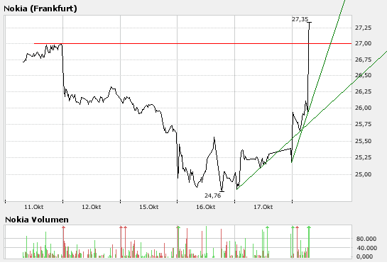 Letztlich stütze auch der sehr hohe positive Trendüberhang die Aktie. So dürfte Nokia in den nächsten Wochen zwar an Dynamik verlieren, längerfristig sei aber mit weiter steigenden Kursen in Richtung des Widerstands bei 29,27 EUR zu rechnen. Ein neues Kaufsignal wäre der signifikante Ausbruch über 26,95 EUR.