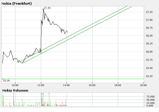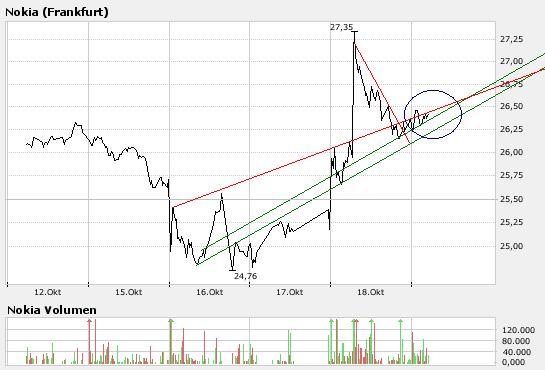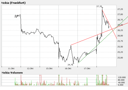 Aus Sicht der technischen Analyse ist die Aktie von Nokia eine gute Halteposition, so Andreas Klähn, Analyst der SEB. Nach dem rasanten Anstieg seit Mitte August könnte die Aktie nun eine Verschnaufpause einlegen. Im Bereich von 26,95 EUR scheine sich ein neuer leichter Widerstand auszubilden. Die mittelfristigen Overbought/ Oversold-Indikatoren würden ein Überkauft- Szenario und eine Herausnahme der Aufwärtsbewegungsdynamik signalisieren. Anzeichen für eine bevorstehende größere Abwärtsbewegung gebe es aber nicht.