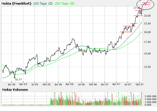 Der weltgrößte Mobiltelefonhersteller habe im 3. Quartal 2007 deutlich mehr verdient, als erwartet. Operativ sei der Gewinn um 69% auf 1,86 Mrd. EUR geklettert. Damit habe das Unternehmen sogar die hoch gesteckten Analystenerwartungen von 1,69 Mrd. EUR übertroffen. Bei einem Umsatzplus von 28% auf 12,90 Mrd. EUR sei der Nettogewinn um 85% auf 1,56 Mrd. EUR gesprungen.