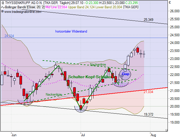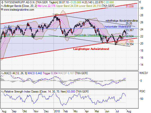 Mal etwas für die Mittel-bis Langfristigen. Charttechnisch gesehen sieht es mittelfristig nicht so ,,gut`` aus. Momentan befindet sich Thyssenkrupp in einem mittelfristigen Abwärtstrendkanal. Der lanfristige Trendkanal ist weiterhin in takt. Eine Kurzfristige Konsolidierung war überfällig! Aber schaut euch mal den RSI Indikator an: Zeichen für Überkauft. Also es wird wohl erst weiter runter gehen. (hängt natürlich auch vom Gesamtmarkt ab, aber wir befinden uns im Dax weiterhin in einer Seitwärtsrange). Das Gap bei ThyssenKrupp, welches bei 22€ liegt, wird geschlossen werden, da bin ich mir ziemlich sicher! In diesem Bereich gibt es auch wieder gute Einstiegsmöglichkeiten. Die wichtigeste Hürde (mittelfristig) ist der Mittelfristige Abwärtstrend! |