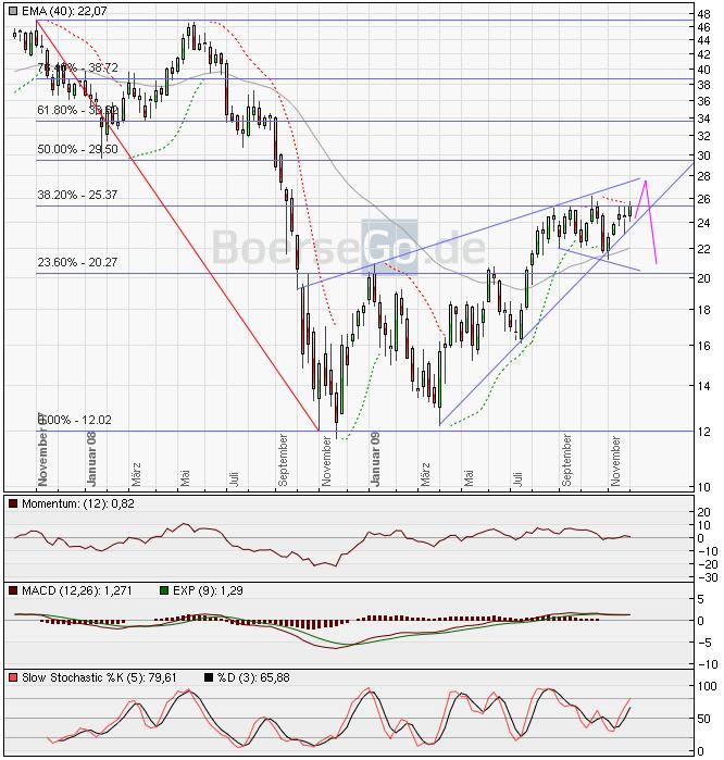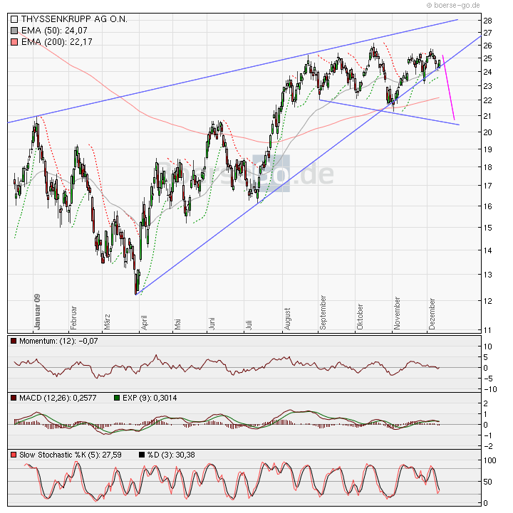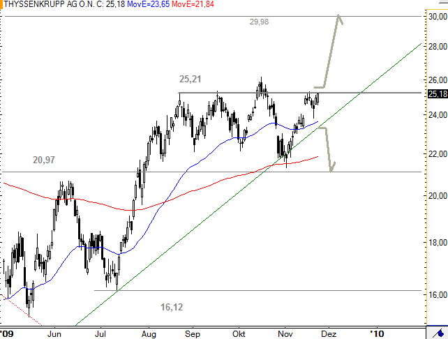 Rückblick: Es wird wieder richtig spannend in den Aktien von Thyssen Krupp, die gestern und heute Kursgewinne für sich verbuchen konnten und damit erneut am Widerstand bei 25,21 Euro angelangt sind. Dieser deckelt die Kurse nun schon seit Ende August und den Bullen ist es bisher nicht gelungen, nachhaltig Kurse oberhalb dieses Widerstands zu etablieren. Vielmehr konsolidiert die Aktie unterhalb dessen und ein erster Ausbruchsversuch Mitte Oktober scheiterte. Dieses Fehlsignal leitete im Anschluss eine relativ dynamische Verkaufswelle bis auf die exp. GDL 200 ein, wo sich die Aktie jedoch wieder stabilisieren konnte.