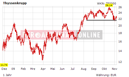 Zwischenzeitlich haben die Analysten von Merck Finck ihre Ansicht zu dem Stahlkocher geändert. Rieten sie bisher dazu, die Aktien zu verkaufen, setzen sie ThyssenKrupp jetzt auf die Kaufliste. Das Kursziel sehen sie bei 30 Euro.